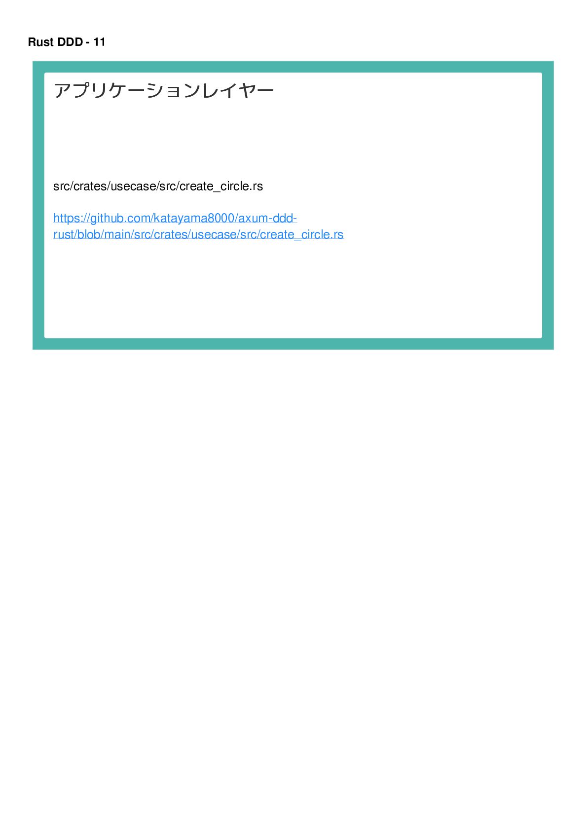 Rust DDD - 11 アプリケーションレイヤー アプリケーションレイヤー src/crates/usecase/src/create_circle.rs https://github.com/katayama8000/axum-ddd- rust/blob/main/src/crates/usecase/src/create_circle.rs