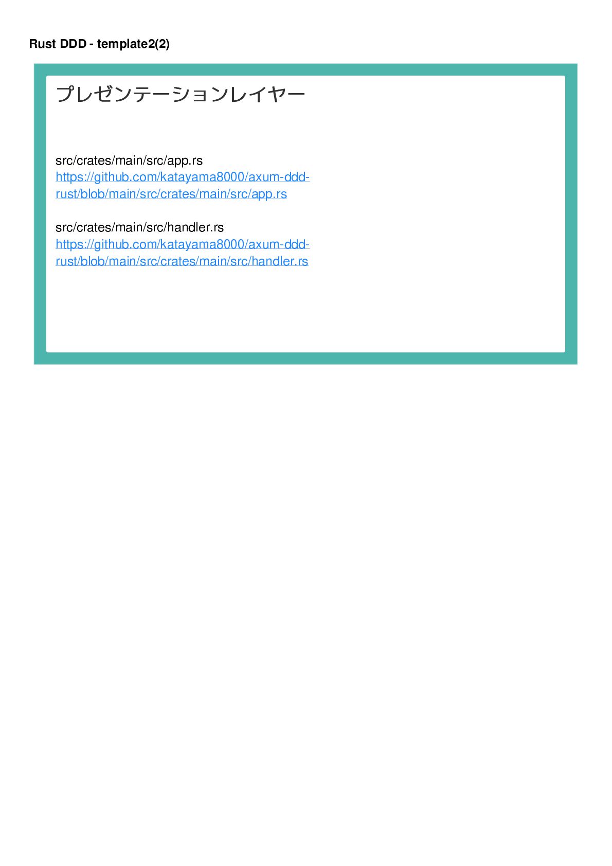 Rust DDD - template2(2) プレゼンテーションレイヤー プレゼンテーションレイヤー src/crates/main/src/app.rs https://github.com/katayama8000/axum-ddd- rust/blob/main/src/crates/main/src/app.rs src/crates/main/src/handler.rs