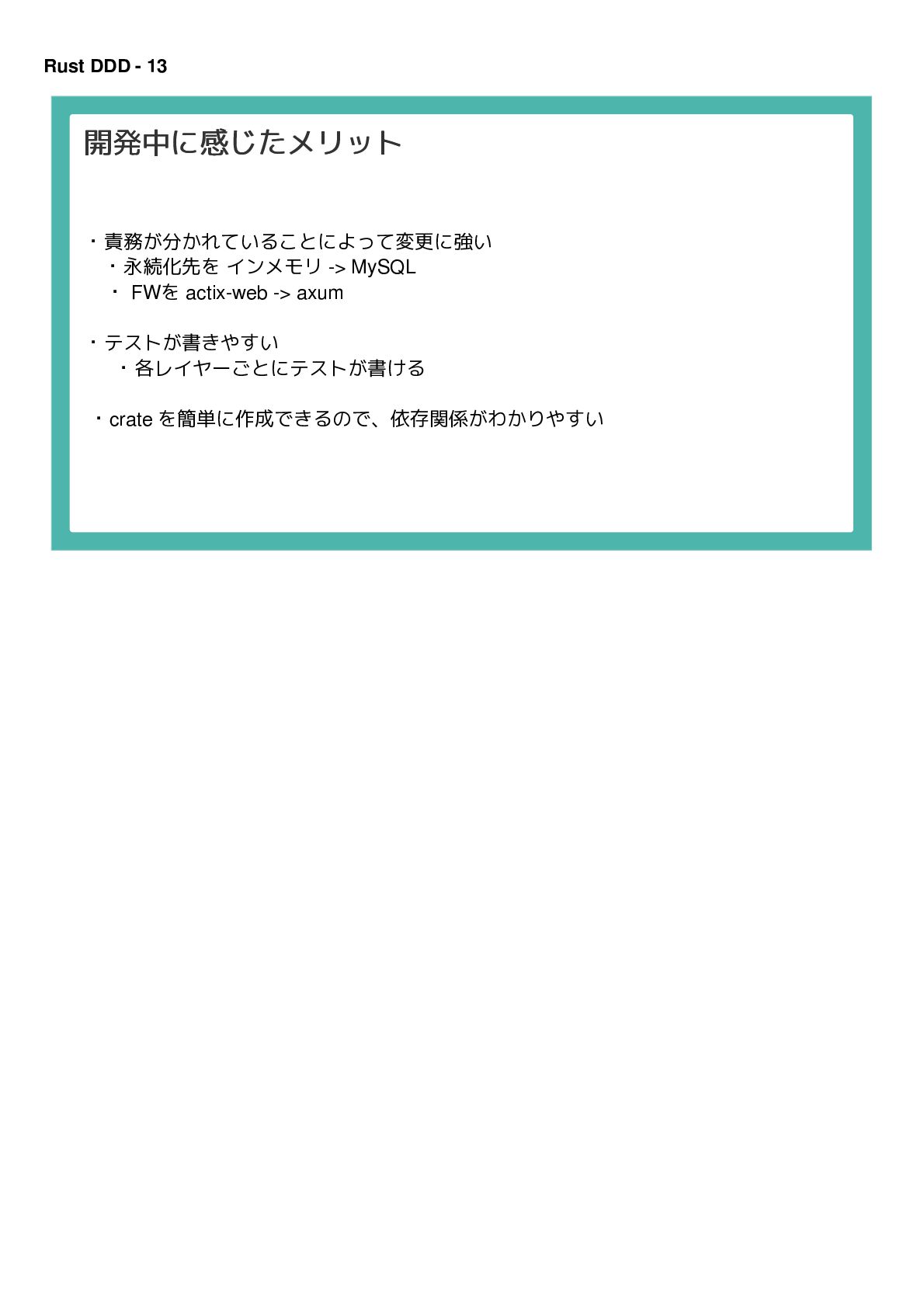 Rust DDD - 13 開発中に感じたメリット 開発中に感じたメリット ・責務が分かれていることによって変更に強い ・永続化先を インメモリ ->