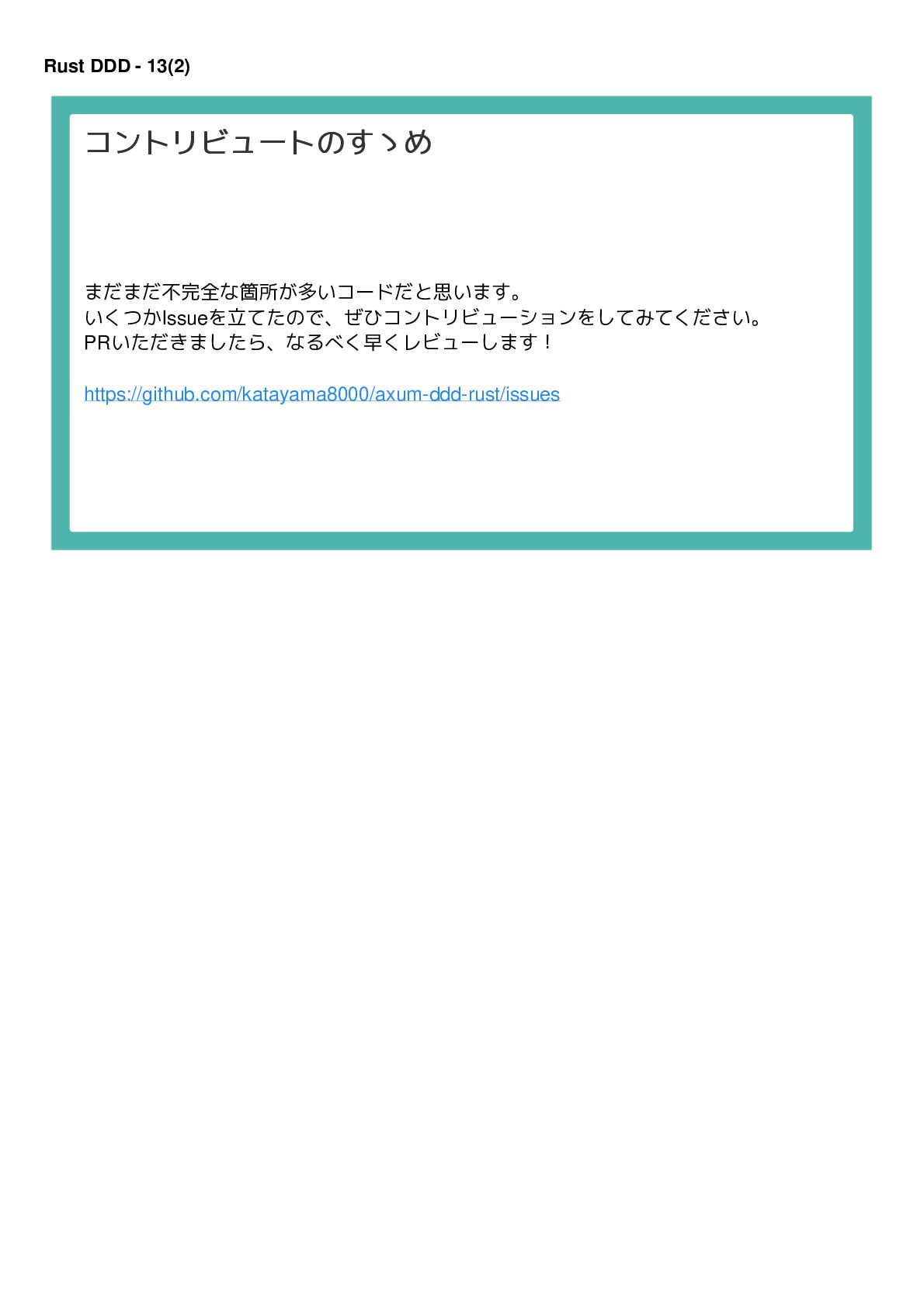 Rust DDD - 13(2) コントリビュートのすゝめ コントリビュートのすゝめ まだまだ不完全な箇所が多いコードだと思います。 いくつかIssueを立てたので、ぜひコントリビューションをしてみてください。 PRいただきましたら、なるべく早くレビューします! https://github.com/katayama8000/axum-ddd-rust/issues