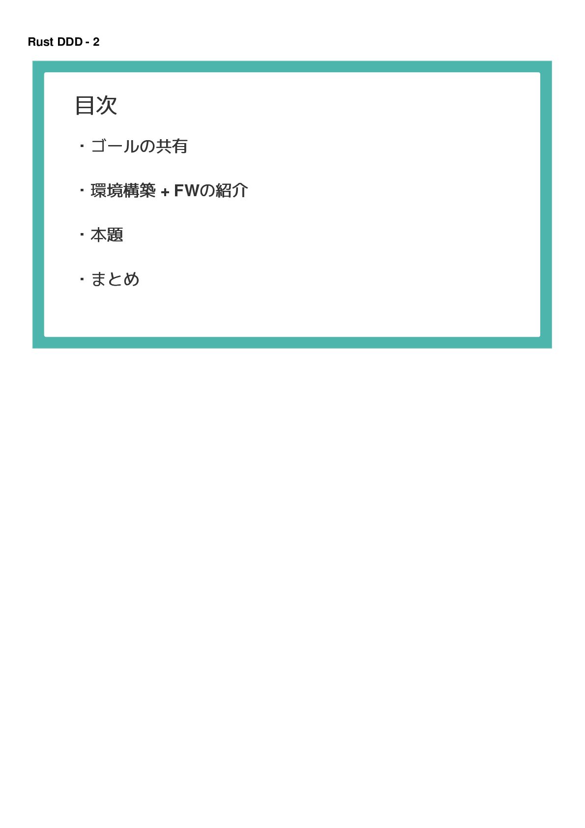Rust DDD - 2 目次 目次 ・ゴールの共有 ・ゴールの共有 ・環境構築 ・環境構築