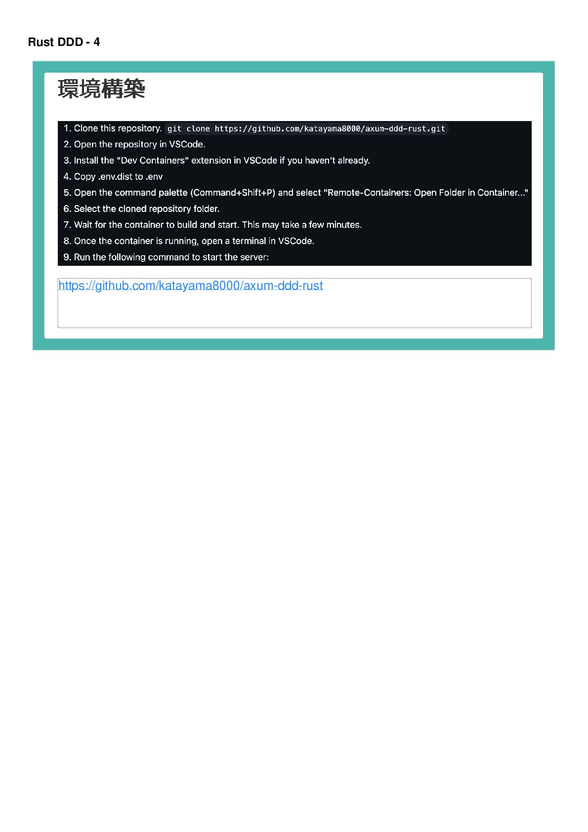 Rust DDD - 4 環境構築 環境構築 https://github.com/katayama8000/axum-ddd-rust