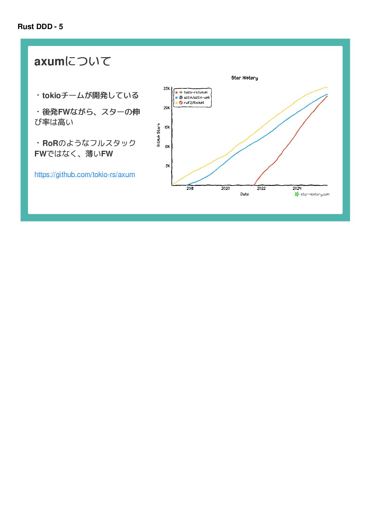 Rust DDD - 5 axumについて について ・ ・tokioチームが開発している チームが開発している ・