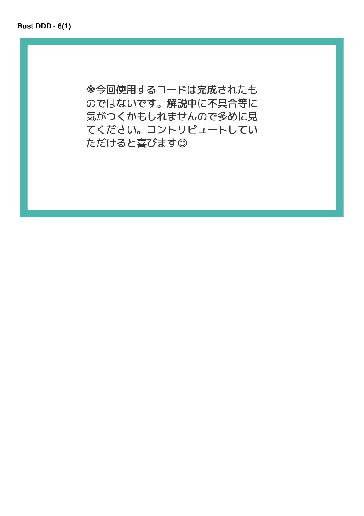 Rust DDD - 6(1) ※今回使用するコードは完成されたも 今回使用するコードは完成されたも のではないです。解説中に不具合等に のではないです。解説中に不具合等に 気がつくかもしれませんので多めに見 気がつくかもしれませんので多めに見