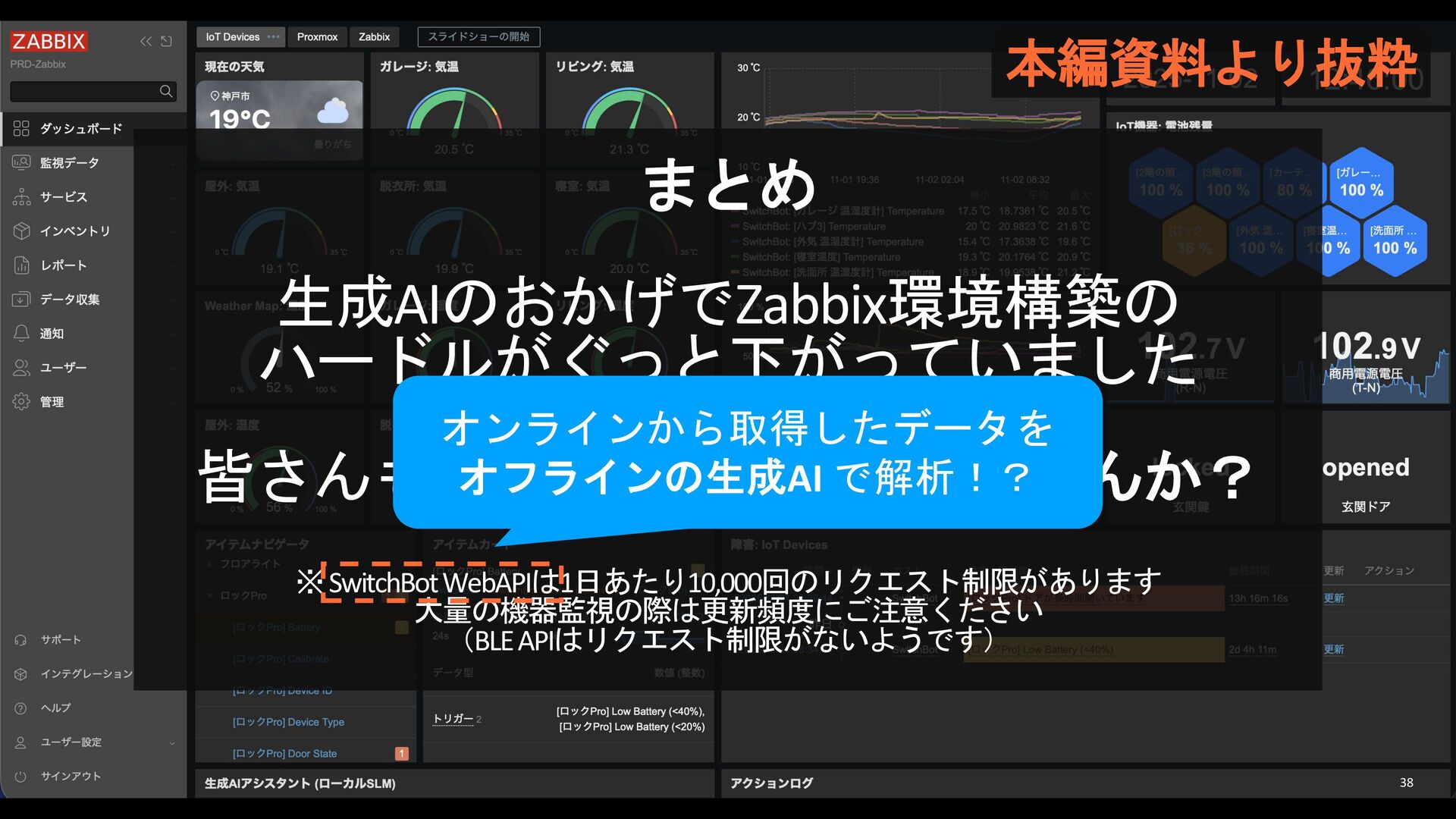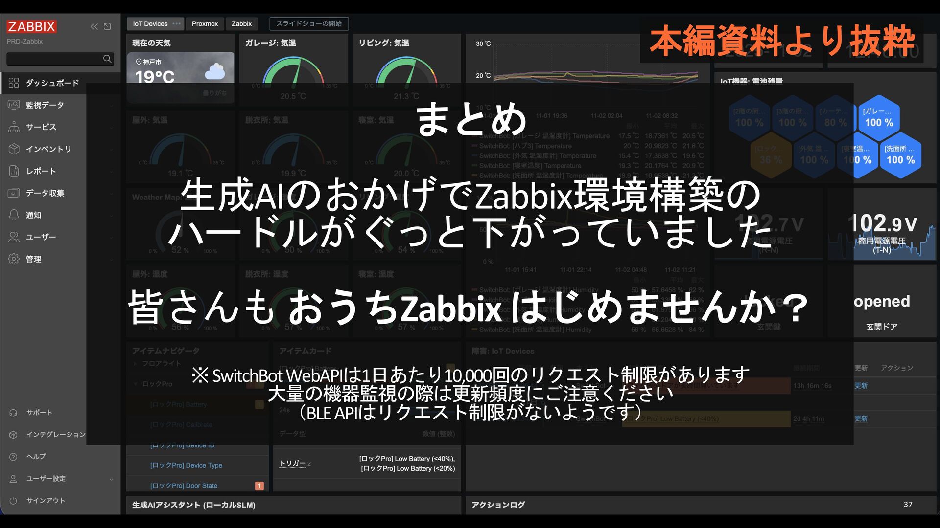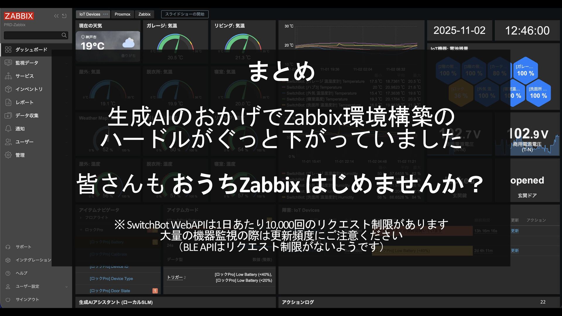 まとめ 生成AIのおかげでZabbix環境構築の ハードルがぐっと下がっていました 皆さんも おうちZabbix はじめませんか? ※SwitchBot WebAPIは1日あたり10,000回のリクエスト制限があります 大量の機器監視の際は更新頻度にご注意ください (BLEAPIはリクエスト制限がないようです)