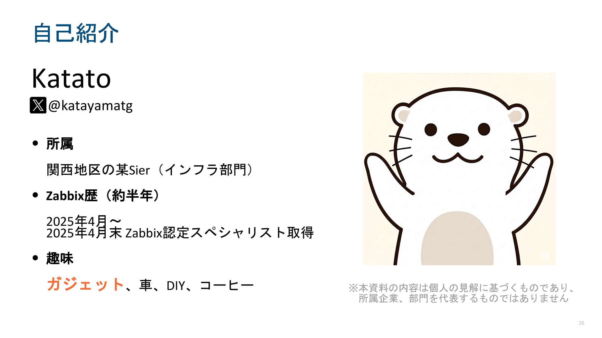 Katato • 所属 関西地区の某Sier(インフラ部門) • Zabbix歴(約半年) 2025年4月~ 2025年4月末 Zabbix認定スペシャリスト取得 •