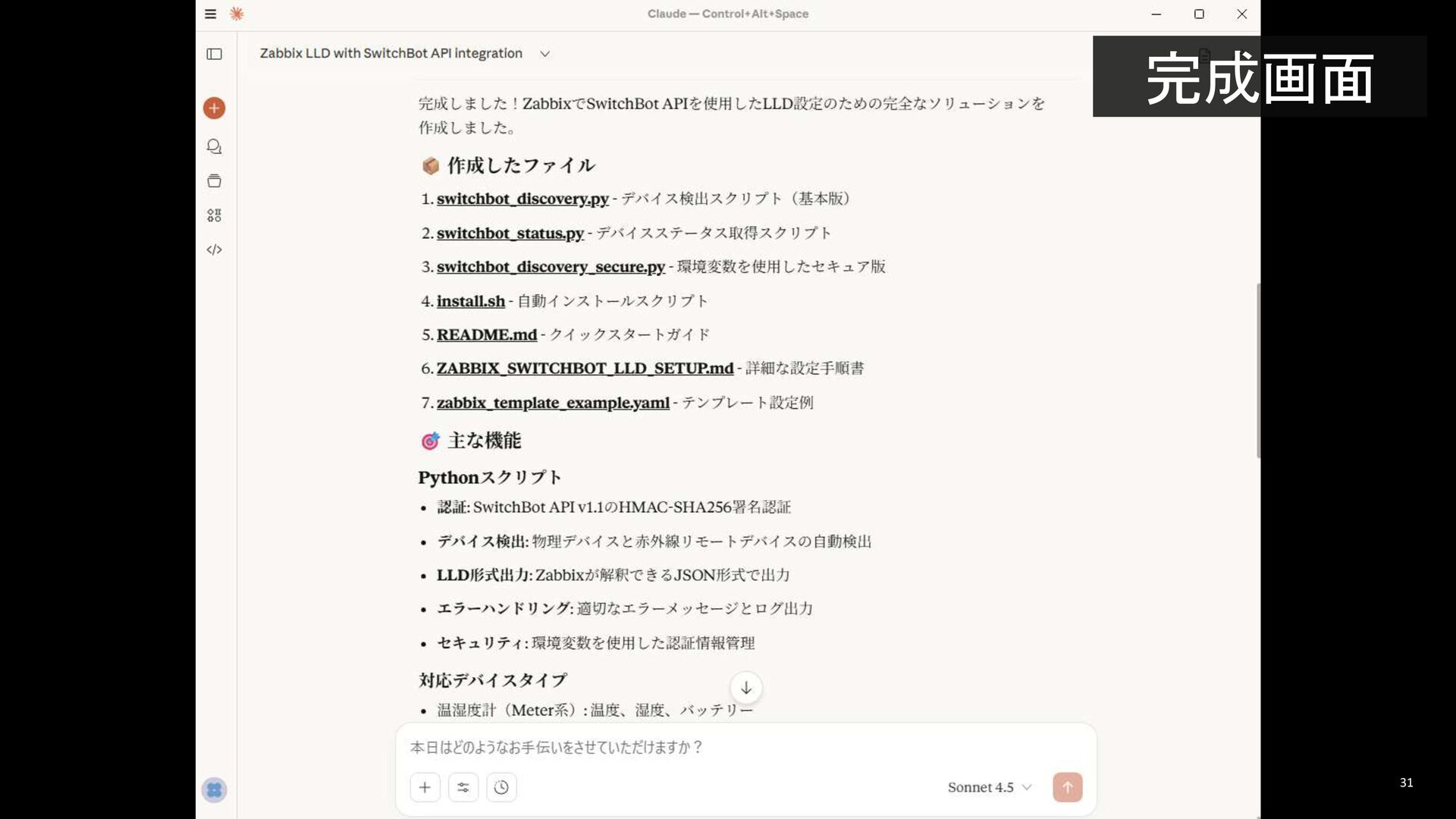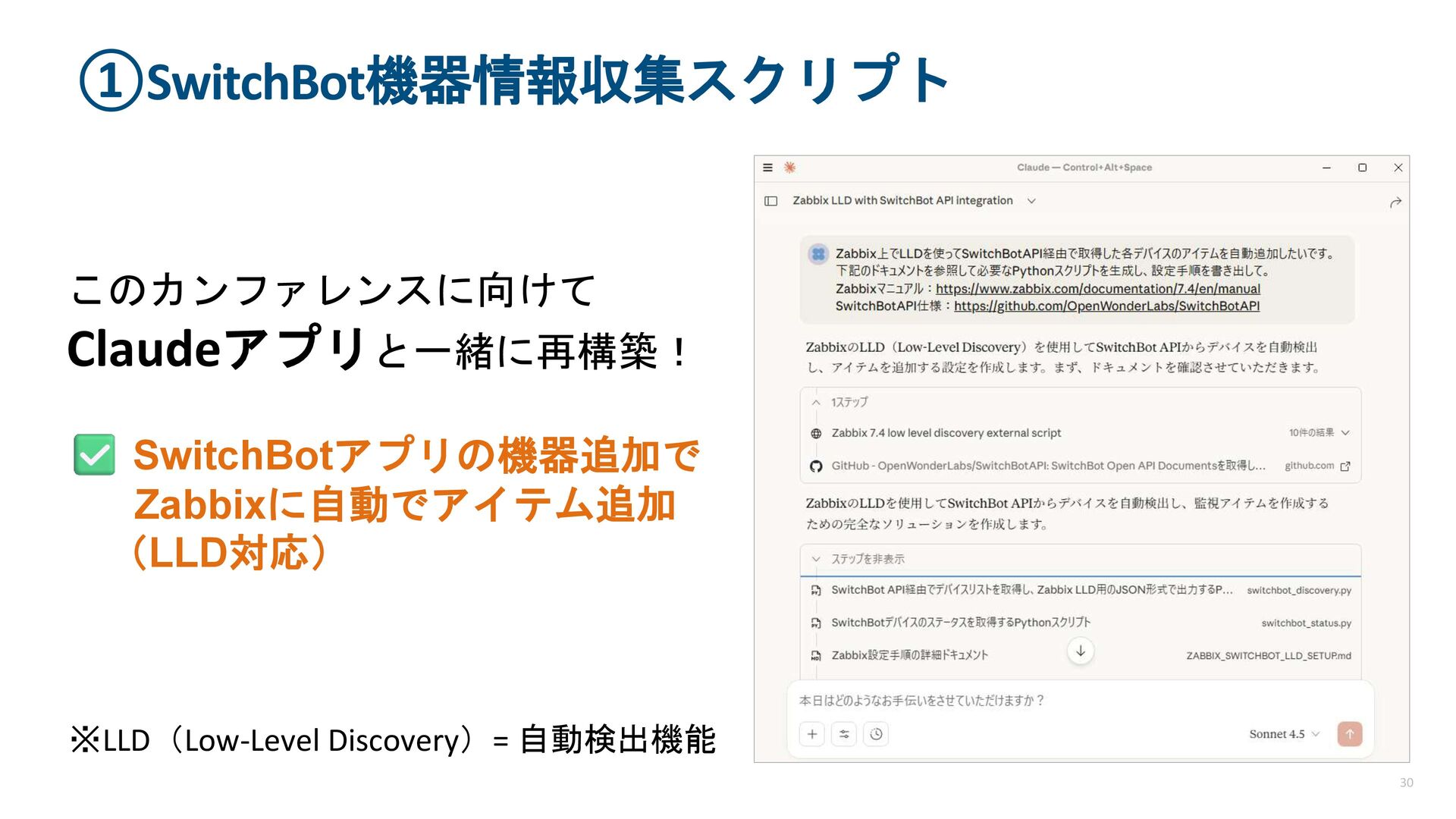 ①SwitchBot機器情報収集スクリプト このカンファレンスに向けて Claudeアプリと一緒に再構築! SwitchBotアプリの機器追加で Zabbixに自動でアイテム追加 (LLD対応) 30 ※LLD(Low-Level Discovery)= 自動検出機能
