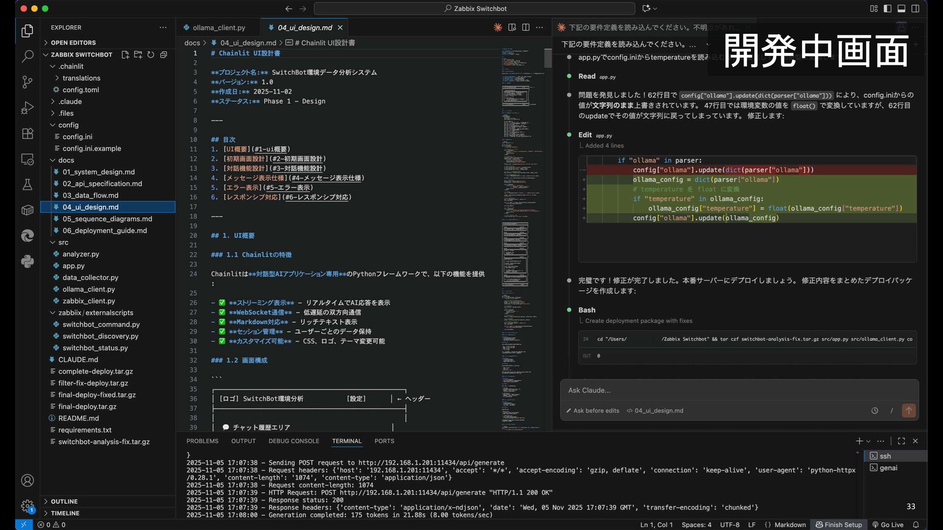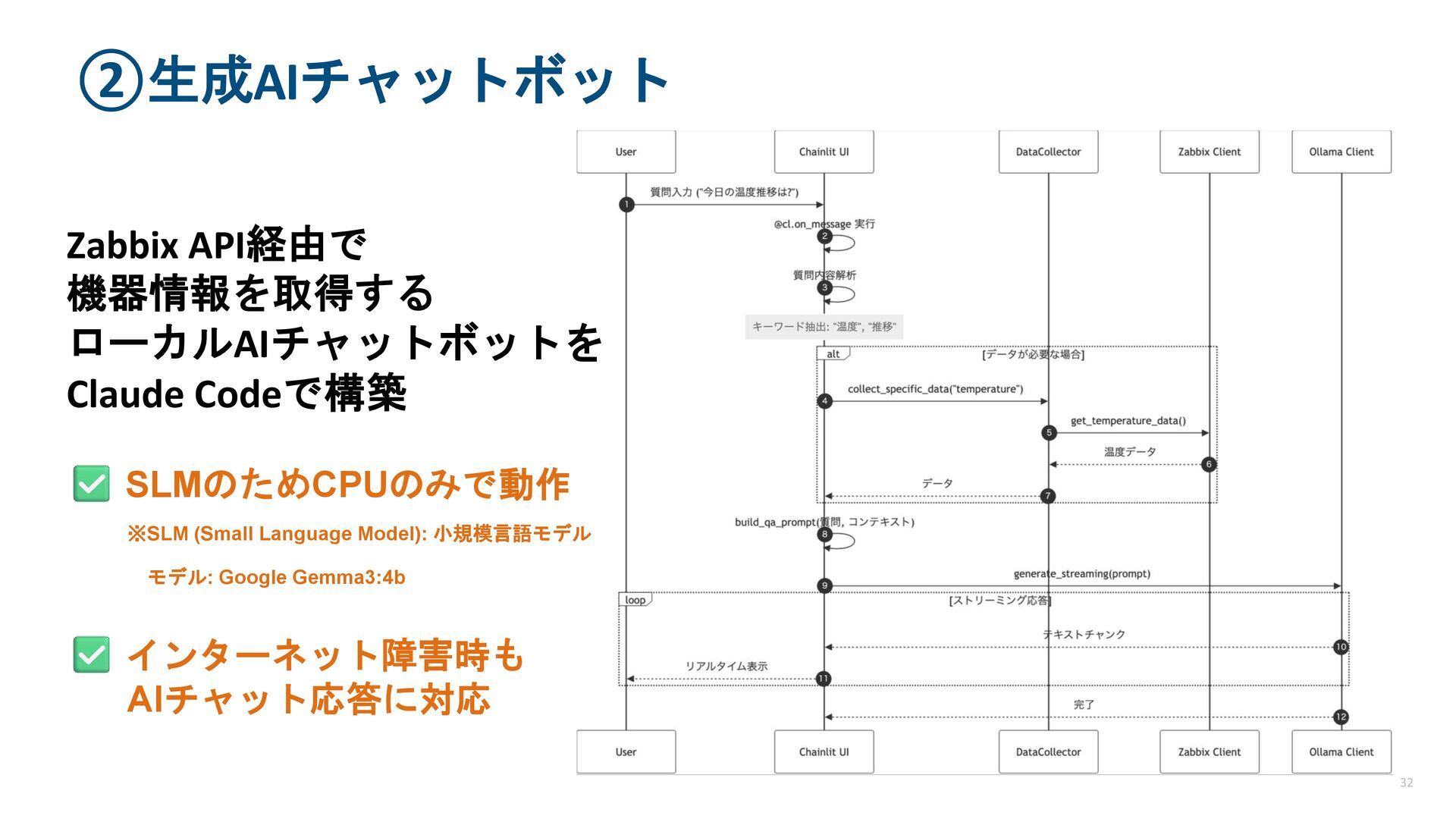 ②生成AIチャットボット 32 Zabbix API経由で 機器情報を取得する ローカルAIチャットボットを Claude Codeで構築 SLMのためCPUのみで動作 ※SLM
