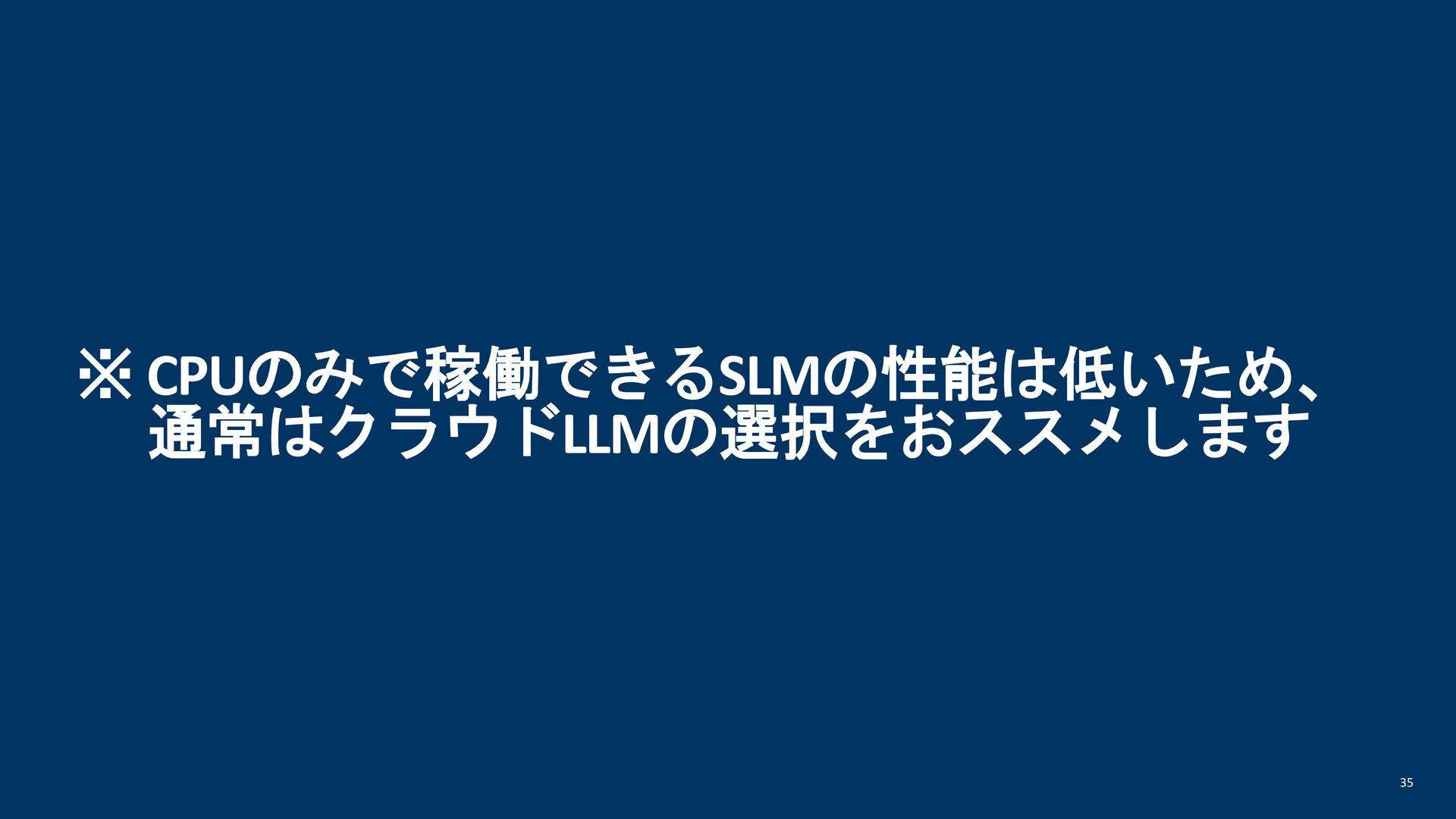 ※ CPUのみで稼働できるSLMの性能は低いため、 通常はクラウドLLMの選択をおススメします 35