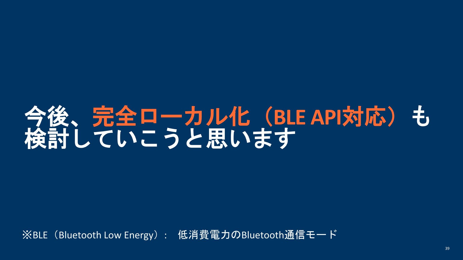 今後、完全ローカル化(BLE API対応)も 検討していこうと思います 39 ※BLE(Bluetooth Low Energy): 低消費電力のBluetooth通信モード