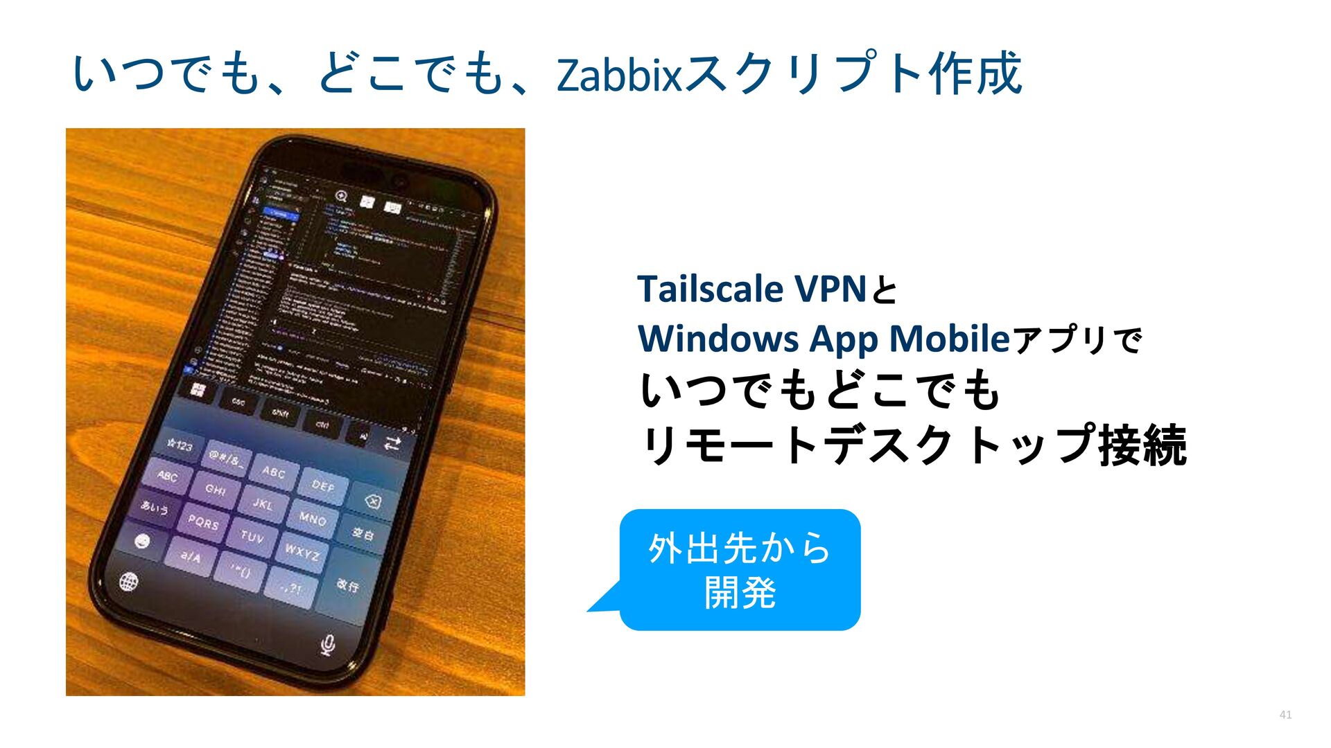 いつでも、どこでも、Zabbixスクリプト作成 Tailscale VPNと Windows App Mobileアプリで いつでもどこでも リモートデスクトップ接続 41 外出先から