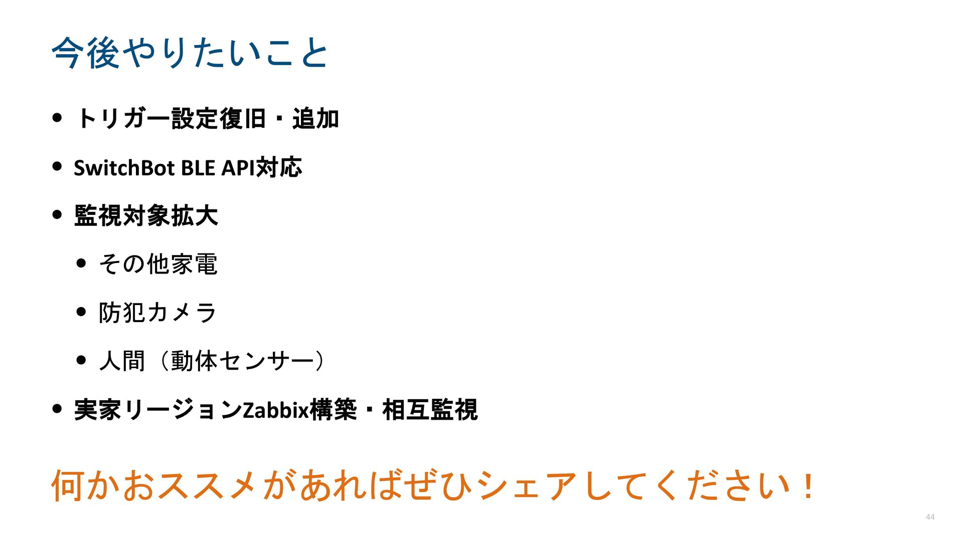 その他家電 • 防犯カメラ • 人間(動体センサー) • 実家リージョンZabbix構築・相互監視 44 何かおススメがあればぜひシェアしてください!