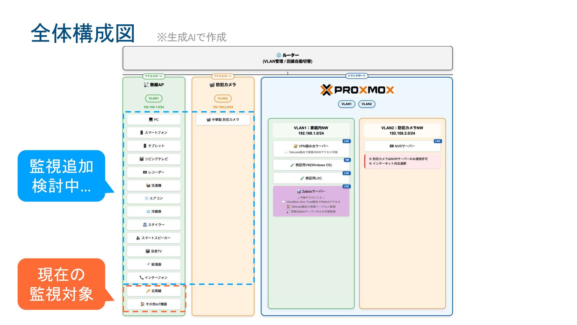 全体構成図 ※生成AIで作成 現在の 監視対象 監視追加 検討中…