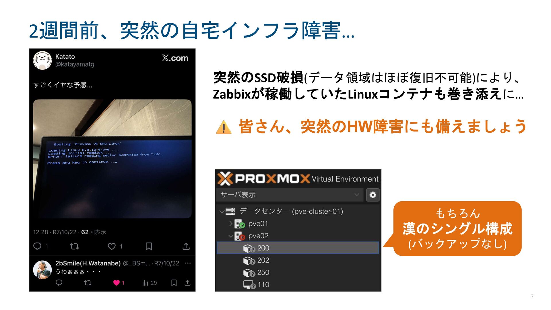 2週間前、突然の自宅インフラ障害… もちろん 漢のシングル構成 (バックアップなし) 突然のSSD破損(データ領域はほぼ復旧不可能)により、 Zabbixが稼働していたLinuxコンテナも巻き添えに… 皆さん、突然のHW障害にも備えましょう 7