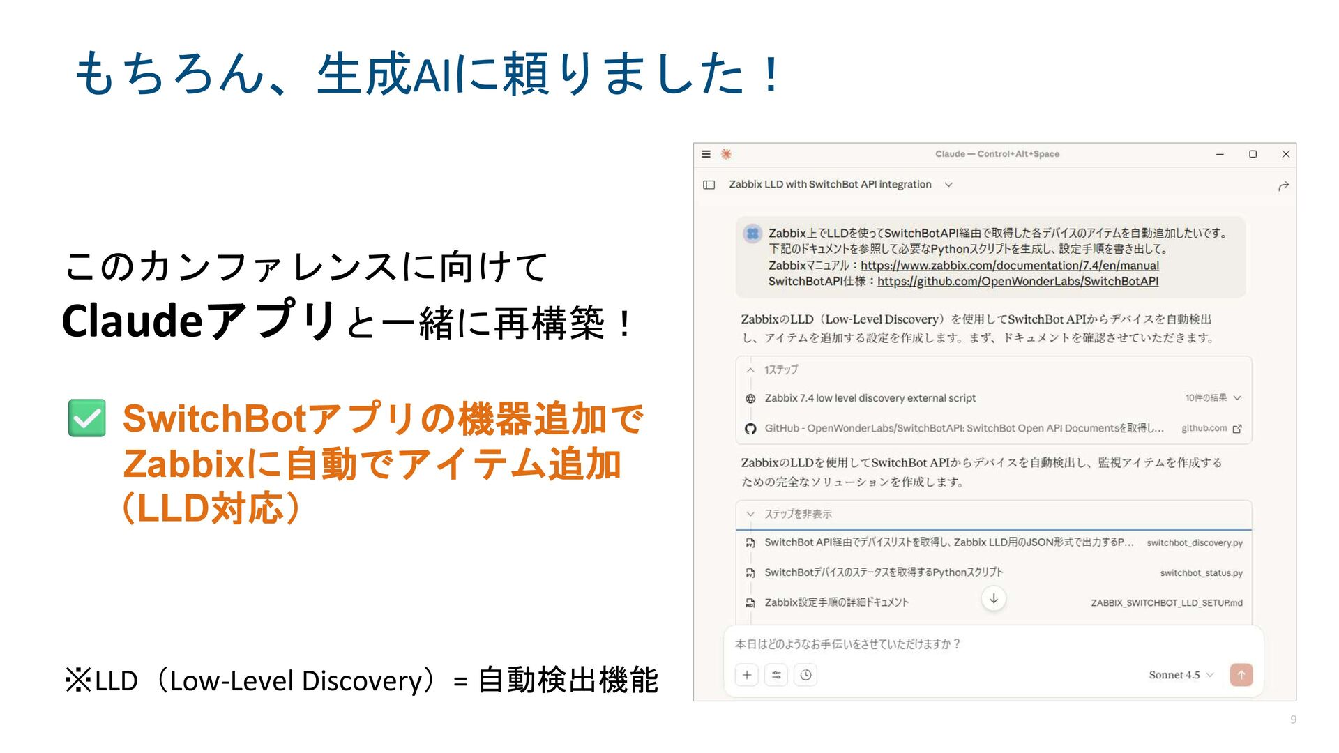 もちろん、生成AIに頼りました! このカンファレンスに向けて Claudeアプリと一緒に再構築! SwitchBotアプリの機器追加で Zabbixに自動でアイテム追加 (LLD対応) 9 ※LLD(Low-Level Discovery)= 自動検出機能
