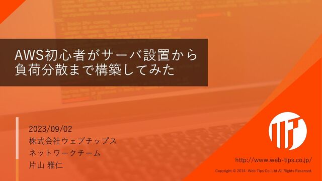 徳島県徳島市南末広町4番53号 エコービル4階 電話番号 088-678-6619 FAX番号 088-678-6669 役員 代表取締役社⻑ CEO:野原 直⼀ 技術担当取締役 CTO:⾕沢 和寿 設⽴ 2013年9⽉20⽇ 資本⾦ 1,000万円 事業内容 オープンソースソフトウェア「シラサギ」開発事業 「シラサギ」を⽤いた受託開発事業 「シラサギ」を⽤いたサポートサービス事業 「シラサギ」を⽤いたクラウドサービス事業 社員数 13名(役員2名) 参加団体 (⼀社)徳島県情報産業協会、(公財)e-とくしま推進財団、OSS コンソーシアム、オープンソースビジネス推進協議会、⽇本OSS推 進フォーラム、とくしまOSS普及協議会、Rubyビジネス推進協議会 2018年 ISMS取得 自社開発のオープンソースソフトウェア「シラサギ」を、全国39都道府県139 社の協業ベンダー様の協力を得て、200以上の団体(官公庁、自治体、大学、 病院など)に導入しています。 2004年 オンプレミスのサーバの運⽤、管理 を経験 2007年 初代iPhone発売 2023年 ウェブチップス⼊社 クラウドサーバ管理を始める ⾃⼰紹介 わたしがAWSを利用して苦労したこと 便利だと思ったことをこのスライド発 表できれば