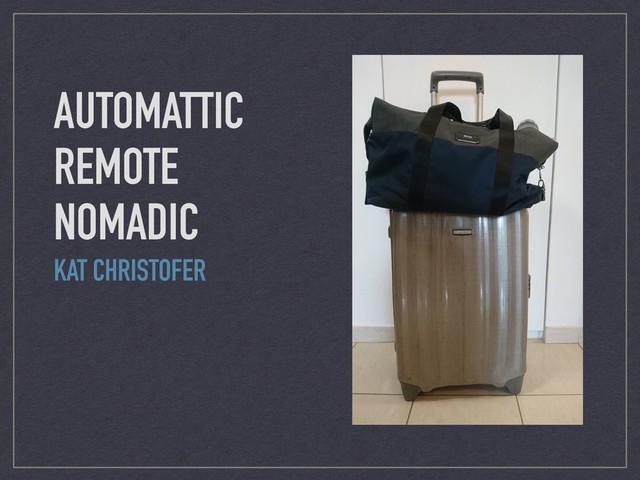 - Docs, Sheets, Gmail, Calendar, Hangouts 1Password, LastPass, RememBear or another password manager Zoom Trello Monday Canva and InVision for design GitHub Droplr CloudUp Zendesk (customized) - tickets HappyChat (in house) - live chat Tracks (in house) and Google Analytics - data WordPress Nomadic Travel journal https://katchristofer.com Instagram https://www.instagram.com/katchristofer/ Mustang Road Trips http://mustang.katchristofer.com How Working Remotely Helped Me See the World - WordCamp Varna https://wordpress.tv/2017/09/30/kat-christopher- how-wordpress-and-working-remotely-helped-me-see-the-world/