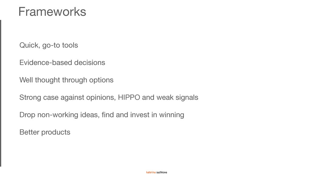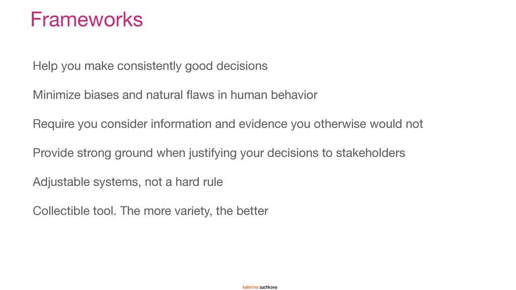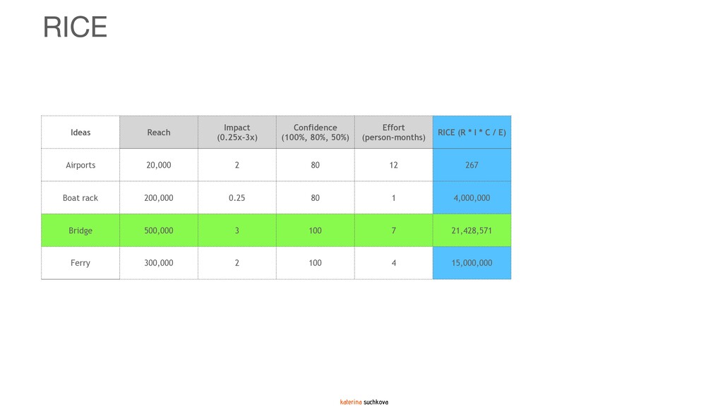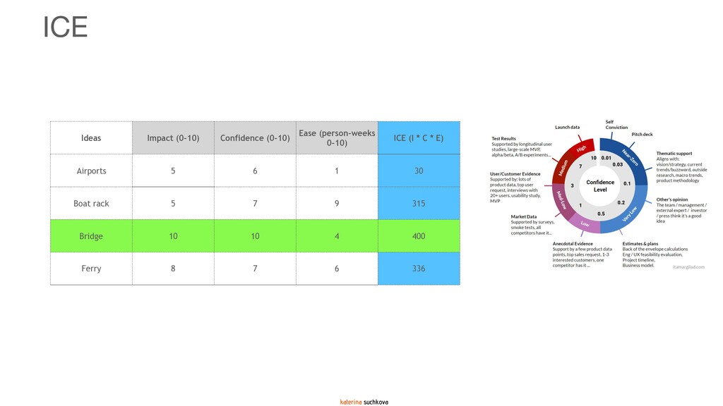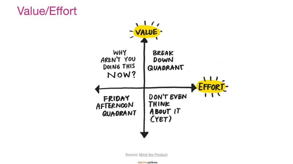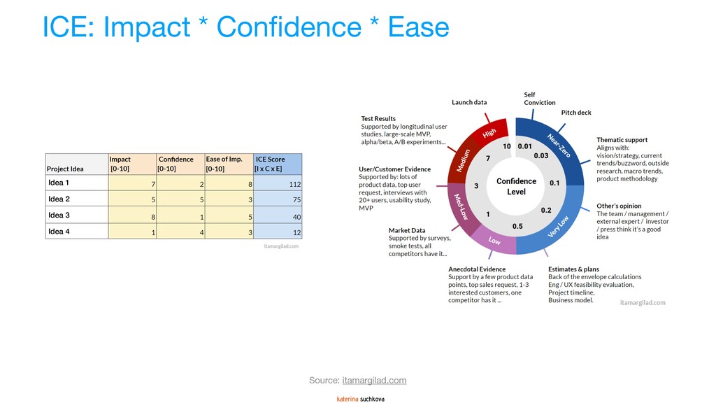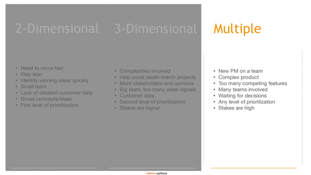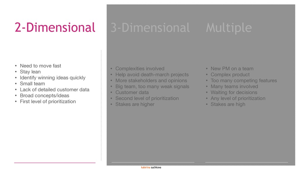 The deck covers several prioritization methodologies (two-dimensional, three-dimensional and multi-dimensional) that can be used as-is if your situation calls for it, or, with some significant adaptations. In my experience, it is quite rare when a framework can be applied 100% to the situation. My recommendation is to use these frameworks as guidance (because none of them are going to be your panacea) to create something similar but more relevant, meaningful and impactful for your product team. Use your company's strategy and vision to create a prioritization formula/framework that reflects what is most important for the organization at this point in time.