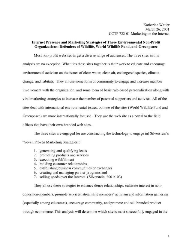 Internet Internet Presence and Marketing Strategies of Three Environmental Non-Profit Organizations: Defenders of Wildlife, World Wildlife Fund, and Greenpeace Most non-profit websites target a diverse range of audiences. The three sites in this analysis are no exception. What ties these sites together is their work to educate and encourage environmental activism on the issues of clean water, clean air, endangered species, climate change, and habitats. They all use some form of community to engage and increase member involvement with the organization, and some form of basic rule-based personalization along with viral marketing strategies to increase the number of potential supporters and activists. All of the sites deal with international environmental issues, but two of the sites (World Wildlife Fund and Greenpeace) are more internationally focused. They use the web site as a portal to the field offices that have their own branded web sites. The three sites are engaged (or are constructing the technology to engage in) Silverstein’s “Seven Proven Marketing Strategies”: 1. generating and qualifying leads 2. promoting products and services 3. executing e-fulfillment 4. building customer relationships 5. establishing business communities or exchanges 6. creating and managing partner programs and 7. selling goods over the Internet. (Silverstein, 2001:103) They all use these strategies to enhance donor relationships, cultivate interest in non- donor/non-members, promote services, streamline members’ activism and information gathering (especially among educators), encourage community, and promote and sell branded product through ecommerce. This analysis will determine which site is most successfully engaged in the 1