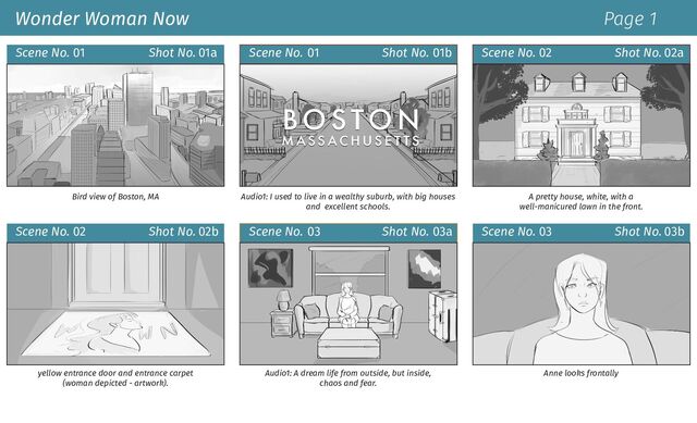 No. Scene No. Scene No. Shot No. Shot No. Shot No. Shot No. Shot No. Shot No. Page 1 01 02 01 03 02 03 01a 02b 01b 02a 03a 03b Bird view of Boston, MA yellow entrance door and entrance carpet (woman depicted - artwork). Audio1: I used to live in a wealthy suburb, with big houses and excellent schools. Audio1: A dream life from outside, but inside, chaos and fear. A pretty house, white, with a well-manicured lawn in the front. Anne looks frontally
