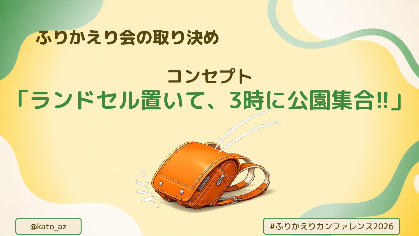 @kato_az #ふりかえりカンファレンス2026 ふりかえり会の取り決め コンセプト 「ランドセル置いて、3時に公園集合!!」