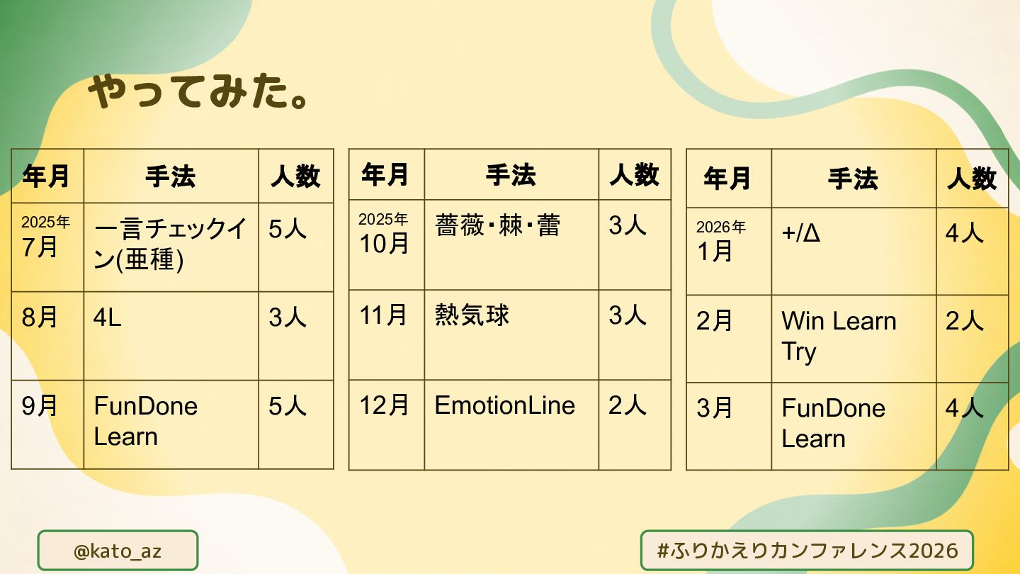 5人 8月 4L 3人 9月 FunDone Learn 5人 年月 手法 人数 2025年 10月 薔薇・棘・蕾 3人 11月 熱気球 3人 12月 EmotionLine 2人 年月 手法 人数 2026年 1月 +/Δ 4人 2月 Win Learn Try 2人 3月 FunDone Learn 4人