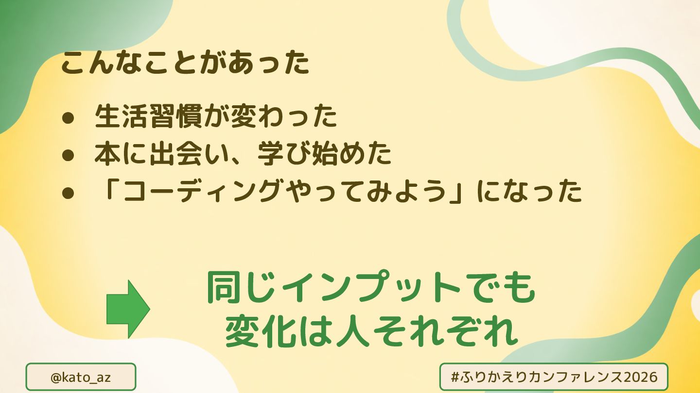 @kato_az #ふりかえりカンファレンス2026 こんなことがあった • 生活習慣が変わった • 本に出会い、学び始めた • 「コーディングやってみよう」になった 同じインプットでも