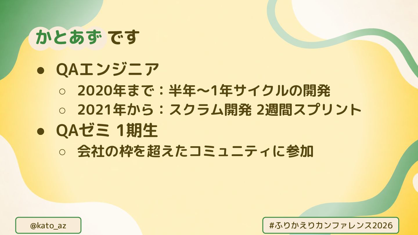 @kato_az #ふりかえりカンファレンス2026 • QAエンジニア ◦ 2020年まで:半年~1年サイクルの開発 ◦ 2021年から:スクラム開発 2週間スプリント •