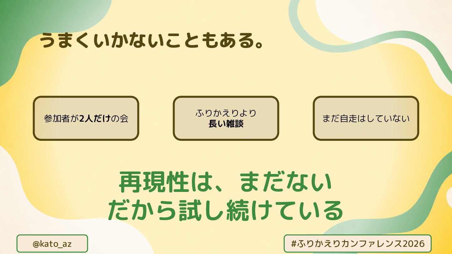 @kato_az #ふりかえりカンファレンス2026 うまくいかないこともある 参加者が2人だけの会 ふりかえりより 長い雑談 まだ自走はしていない 再現性は、まだない だから試し続けている
