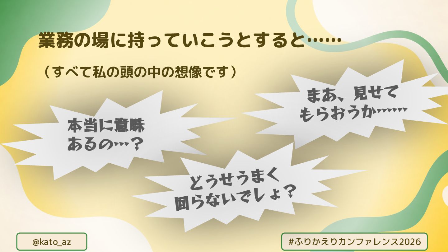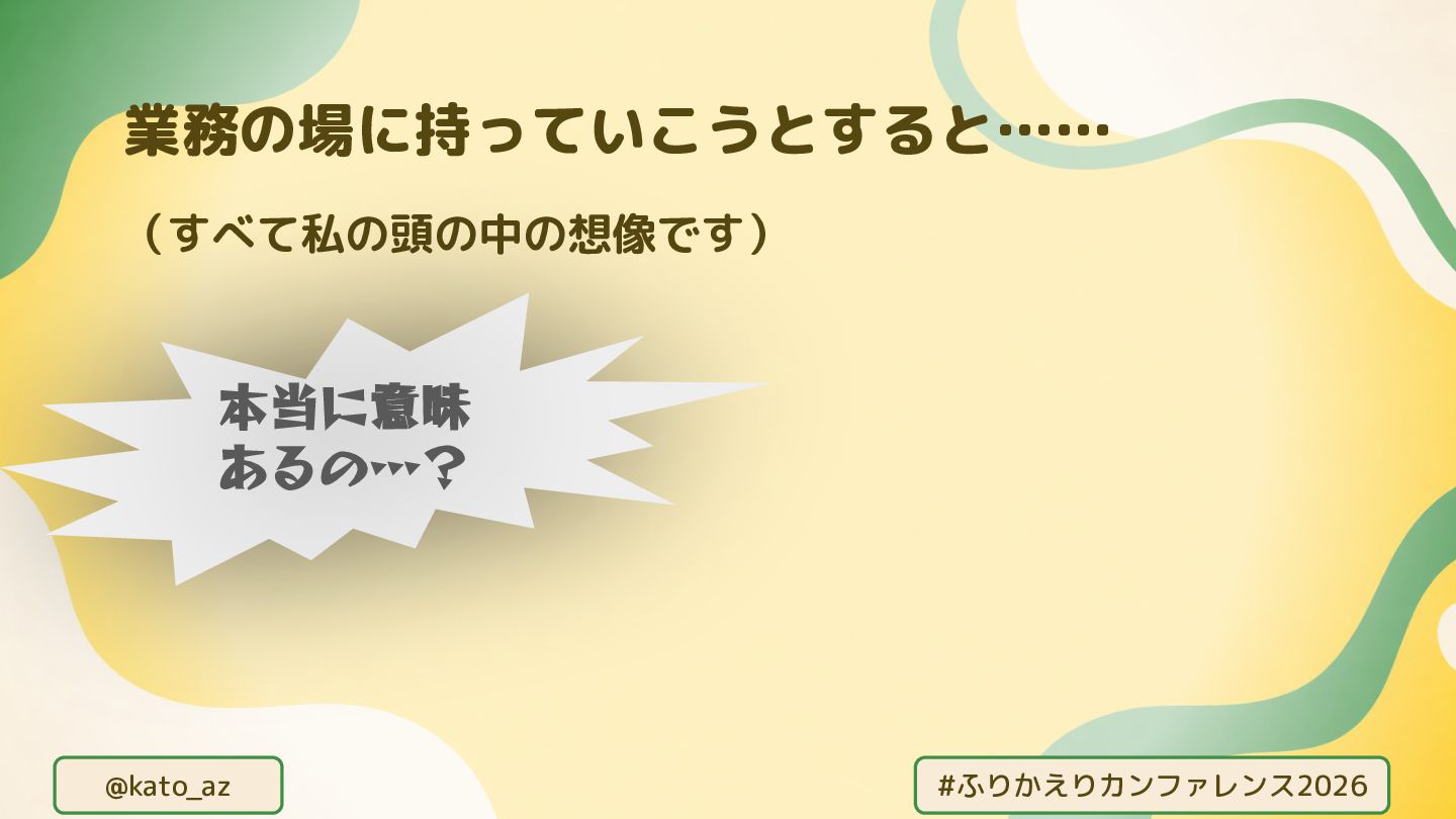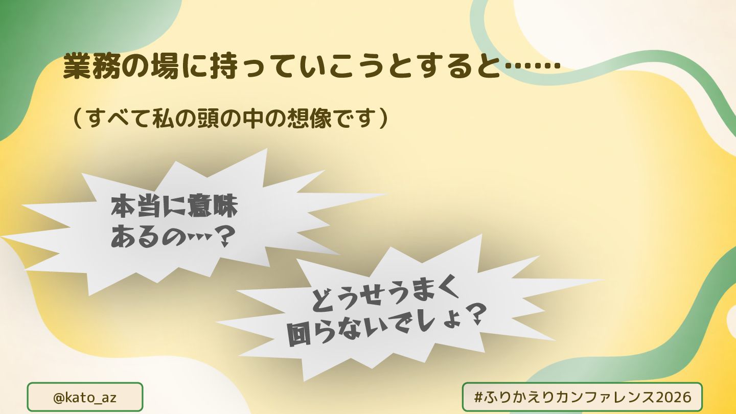 @kato_az #ふりかえりカンファレンス2026 (すべて私の頭の中の想像です) 業務の場に持っていこうとすると…… 本当に意味 あるの…? どうせうまく 回らないでしょ?