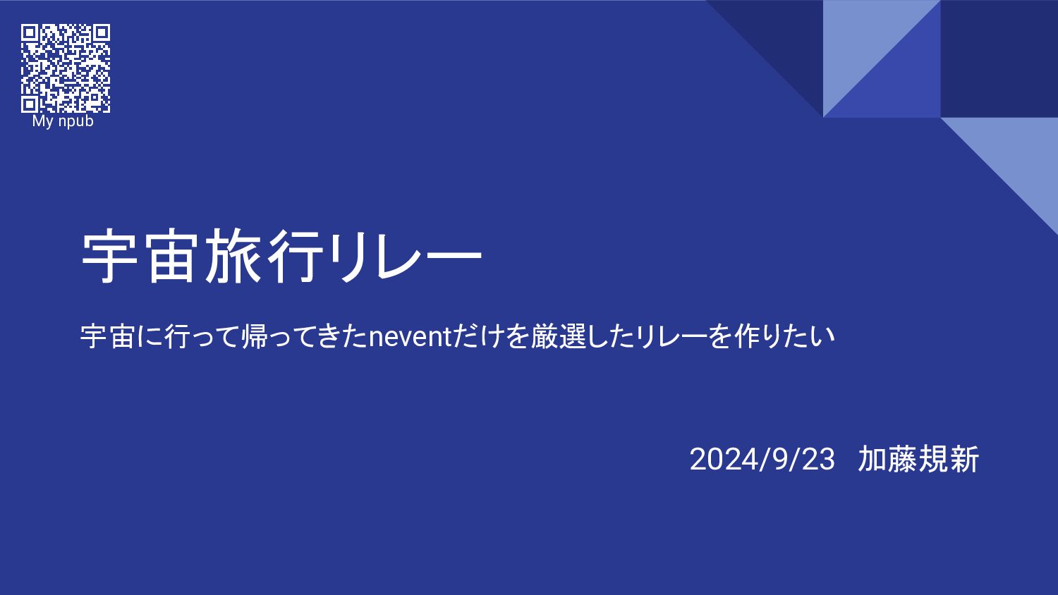 宇宙旅行リレー 宇宙に行って帰ってきたneventだけを厳選したリレーを作りたい 2024/9/23 加藤規新 My npub