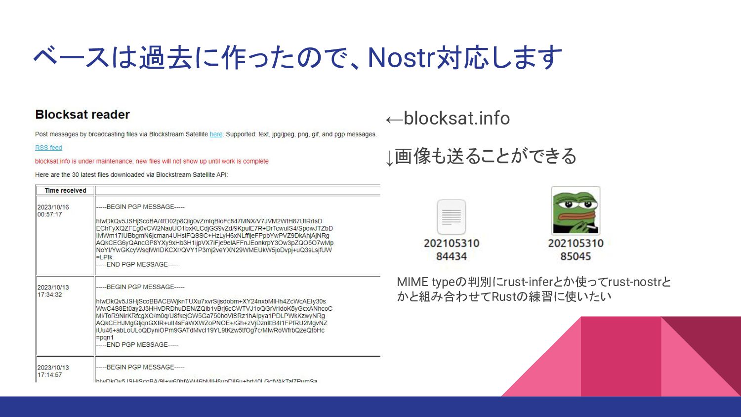ベースは過去に作ったので、Nostr対応します ←blocksat.info ↓画像も送ることができる MIME typeの判別にrust-inferとか使ってrust-nostrと かと組み合わせてRustの練習に使いたい