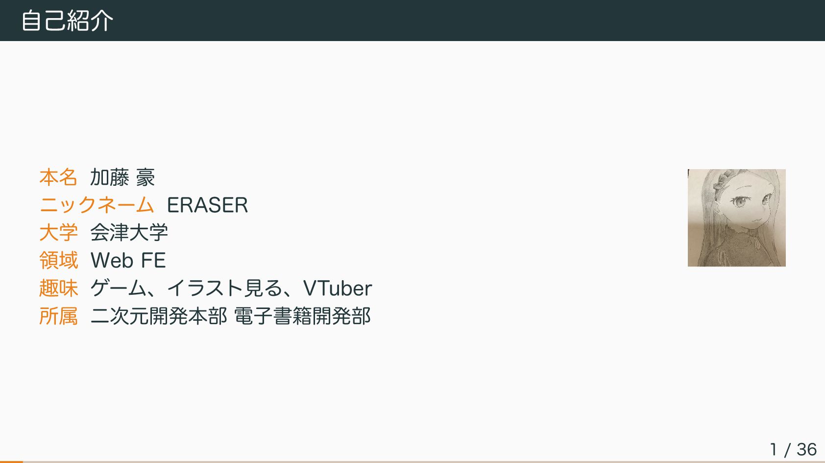 FE 趣味 ゲーム、イラスト見る、VTuber 所属 二次元開発本部 電子書籍開発部 1 / 36