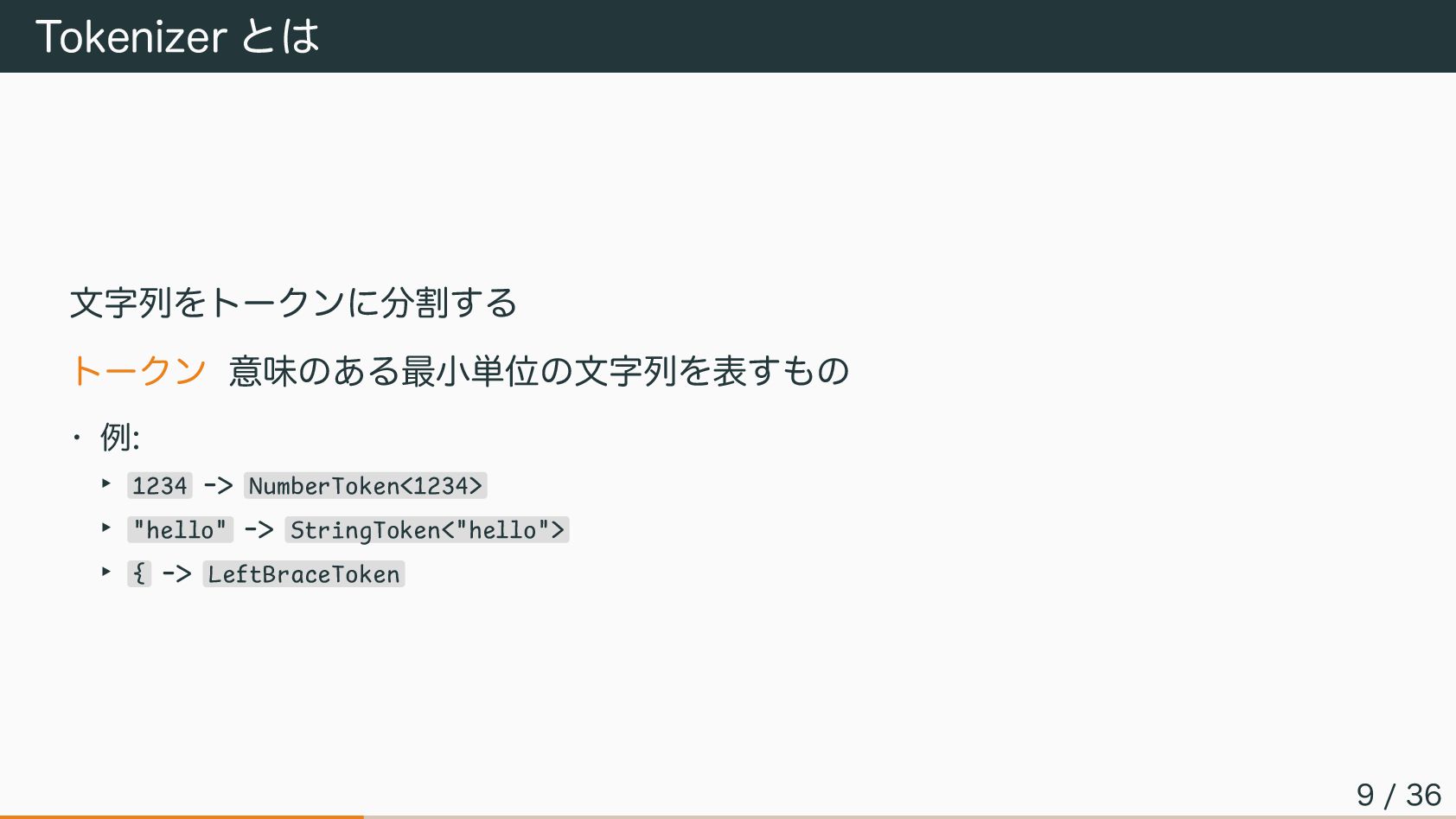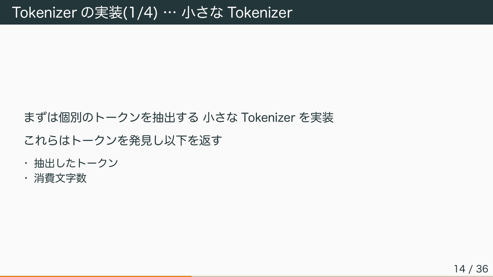 Tokenizer の実装(1/4) … 小さな Tokenizer まずは個別のトークンを抽出する 小さな Tokenizer を実装 これらはトークンを発見し以下を返す