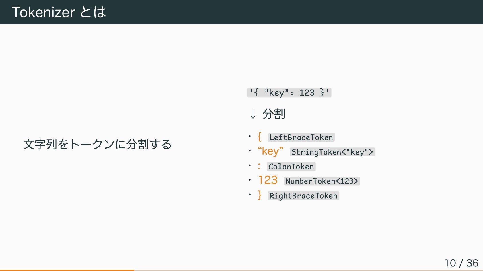 Tokenizer とは 文字列をトークンに分割する '{ "key": 123 }' ↓ 分割 •