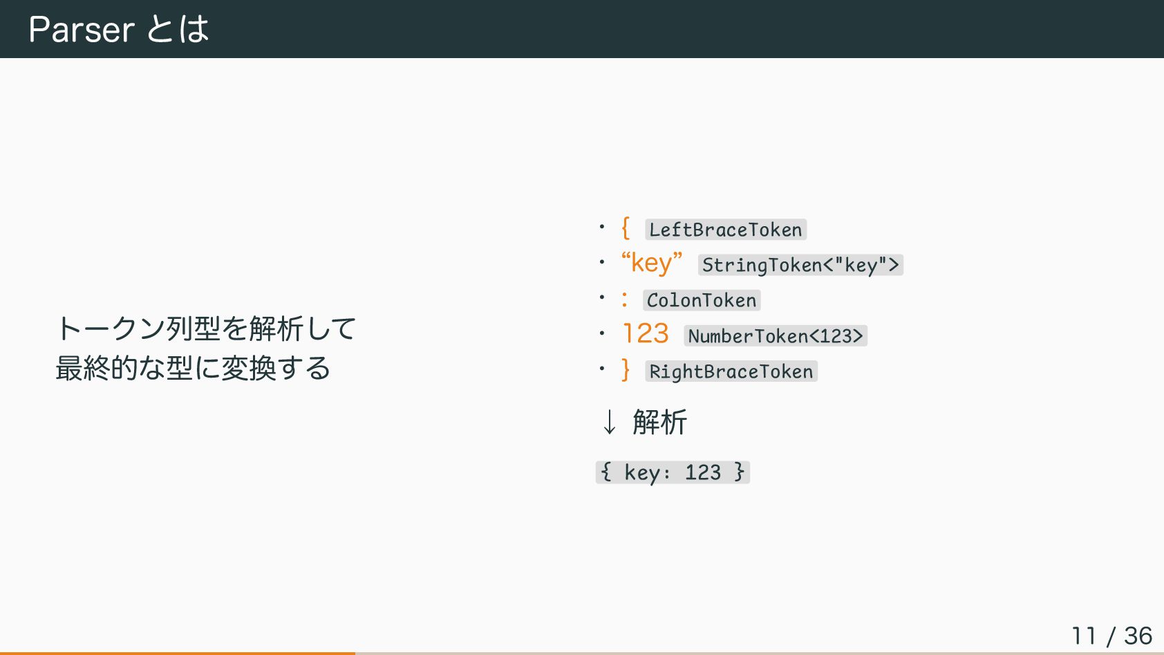 Parser とは トークン列型を解析して 最終的な型に変換する • { LeftBraceToken • “key” StringToken<"key">