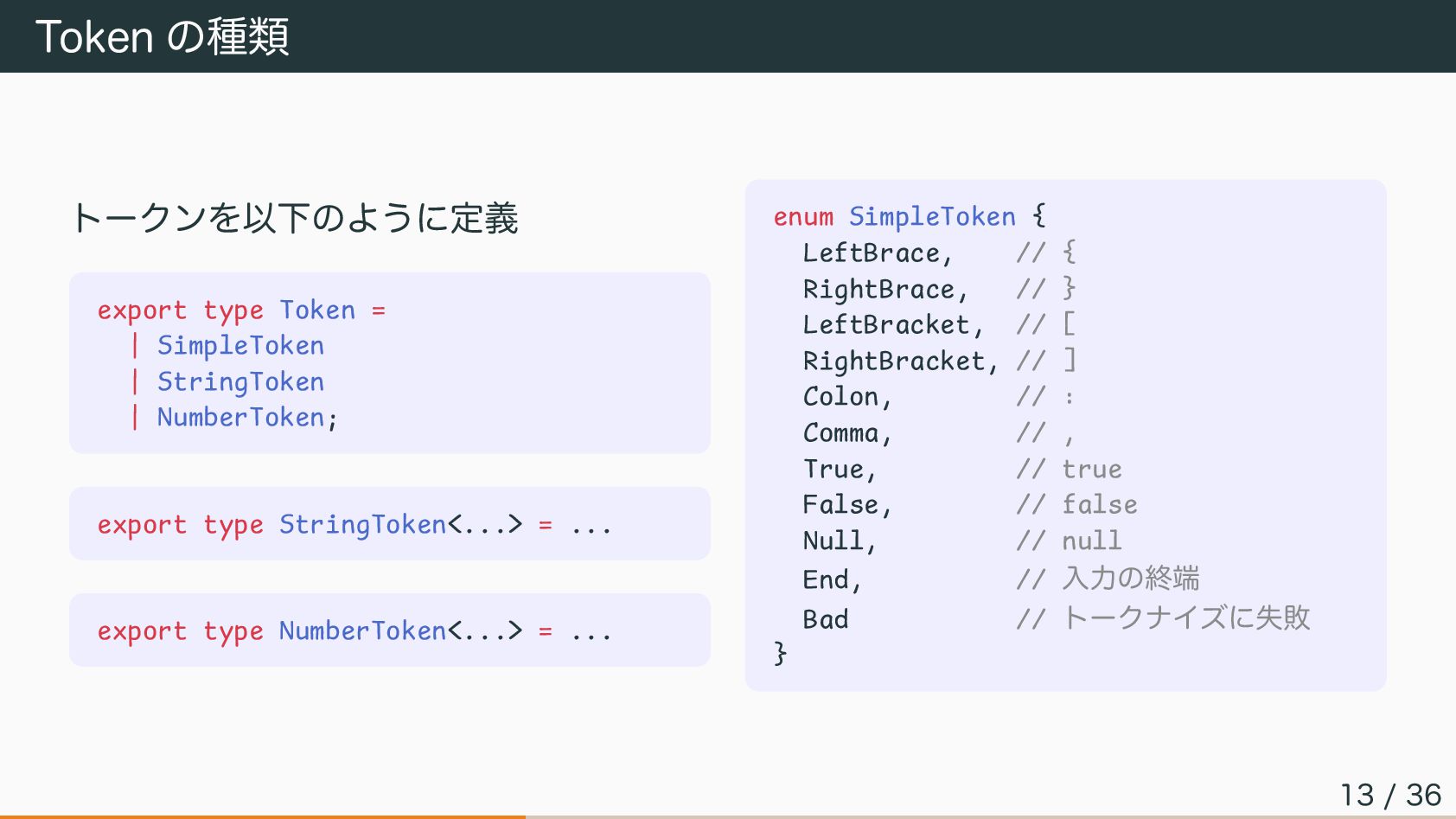 StringToken | NumberToken; export type StringToken<...> = ... export type NumberToken<...> = ... enum SimpleToken { LeftBrace, // { RightBrace, // } LeftBracket, // [ RightBracket, // ] Colon, // : Comma, // , True, // true False, // false Null, // null End, // 入力の終端 Bad // トークナイズに失敗 } 13 / 36