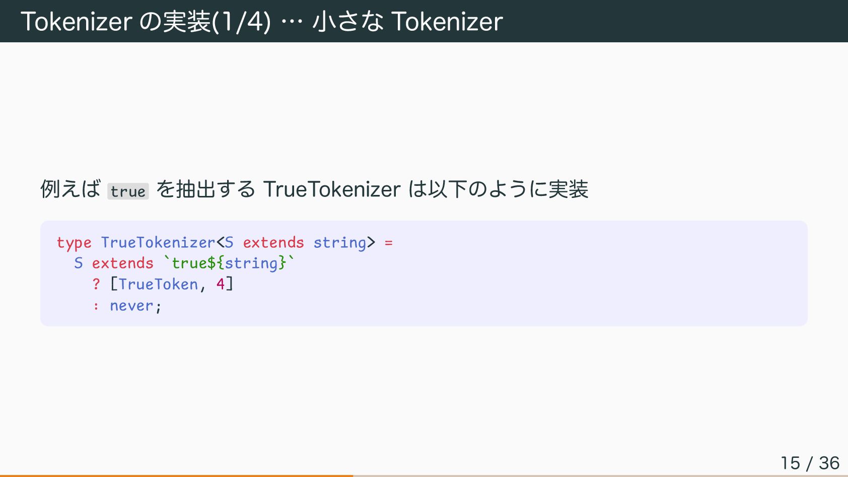 type TrueTokenizer<S extends string> = S extends `true${string}` ? [TrueToken, 4] : never; 15 / 36