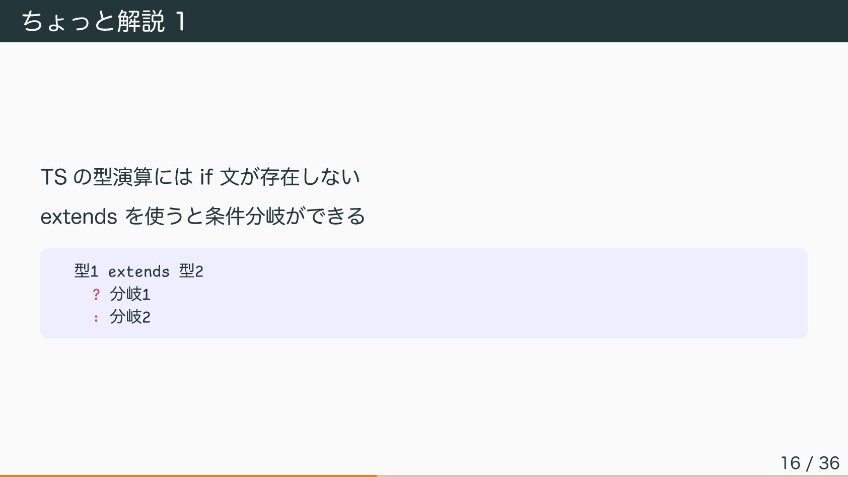ちょっと解説 1 TS の型演算には if 文が存在しない extends を使うと条件分岐ができる 型1 extends