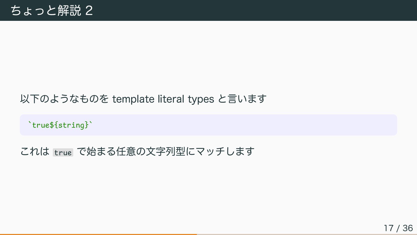 ちょっと解説 2 以下のようなものを template literal types と言います `true${string}` これは true