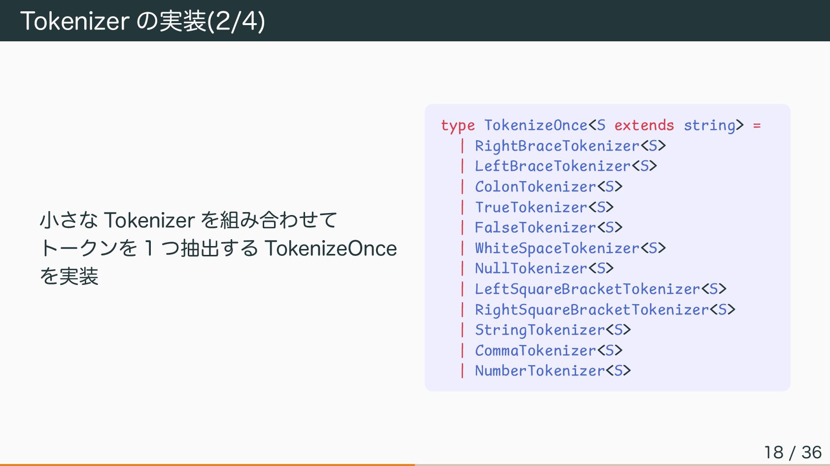 type TokenizeOnce<S extends string> = | RightBraceTokenizer<S> | LeftBraceTokenizer<S> | ColonTokenizer<S> | TrueTokenizer<S> | FalseTokenizer<S> | WhiteSpaceTokenizer<S> | NullTokenizer<S> | LeftSquareBracketTokenizer<S> | RightSquareBracketTokenizer<S> | StringTokenizer<S> | CommaTokenizer<S> | NumberTokenizer<S> 18 / 36