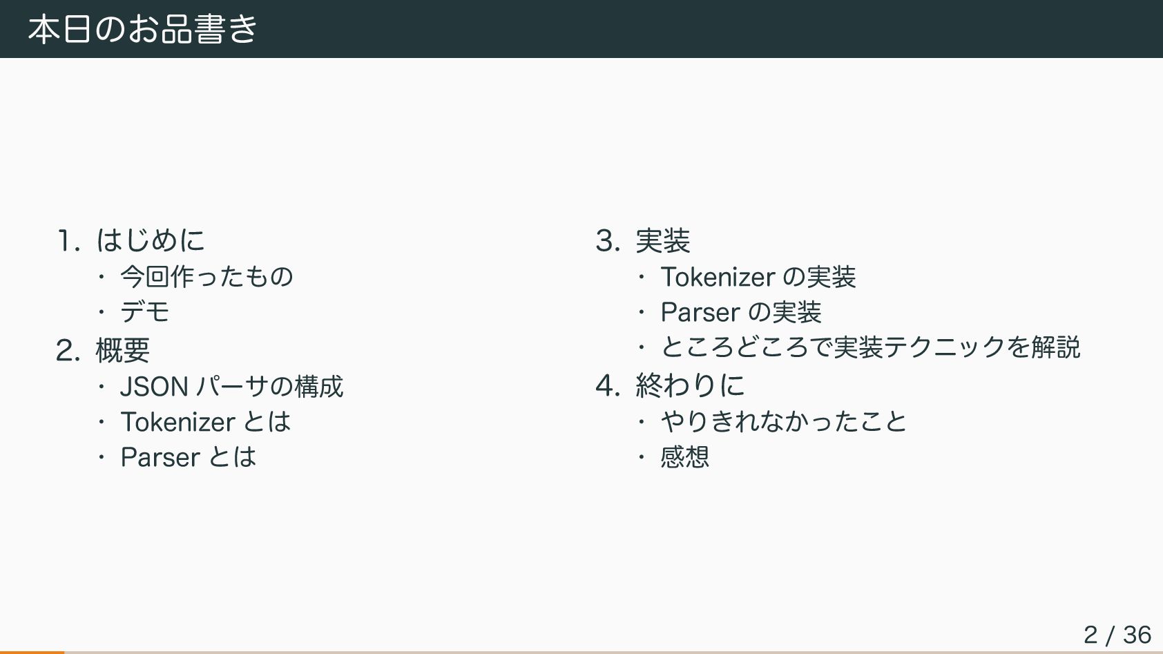 JSON パーサの構成 • Tokenizer とは • Parser とは 3. 実装 • Tokenizer の実装 • Parser の実装 • ところどころで実装テクニックを解説 4. 終わりに • やりきれなかったこと • 感想 2 / 36