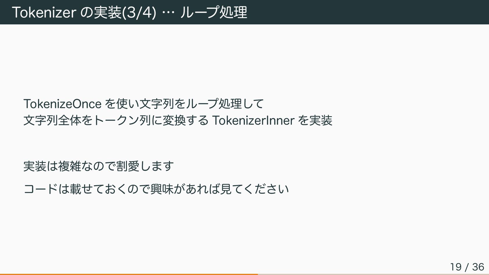 Tokenizer の実装(3/4) … ループ処理 TokenizeOnce を使い文字列をループ処理して 文字列全体をトークン列に変換する TokenizerInner を実装 実装は複雑なので割愛します