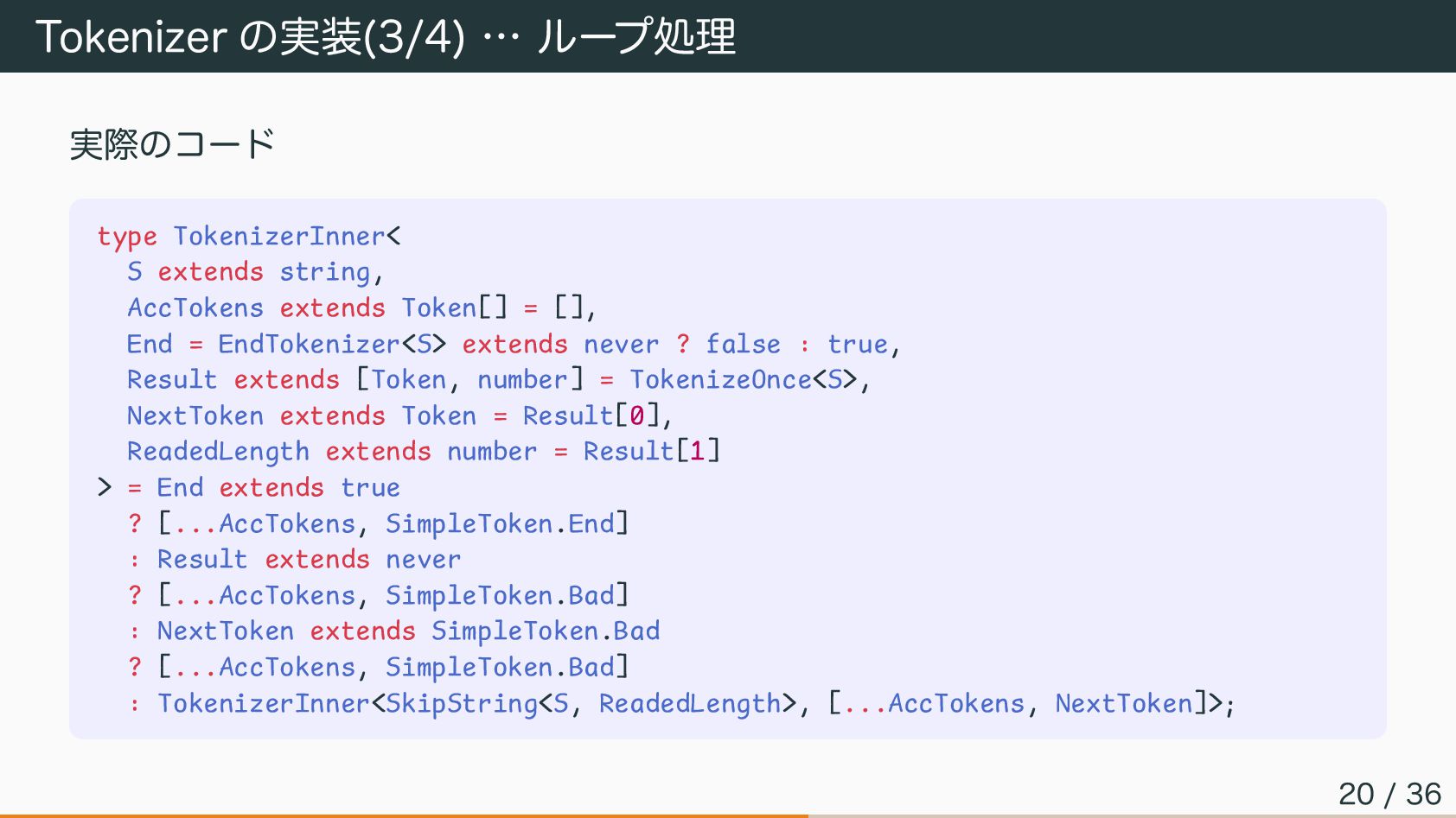 Tokenizer の実装(3/4) … ループ処理 実際のコード type TokenizerInner< S extends string,