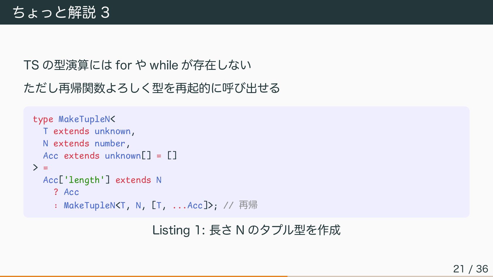 MakeTupleN< T extends unknown, N extends number, Acc extends unknown[] = [] > = Acc['length'] extends N ? Acc : MakeTupleN<T, N, [T, ...Acc]>; // 再帰 Listing 1: 長さ N のタプル型を作成 21 / 36