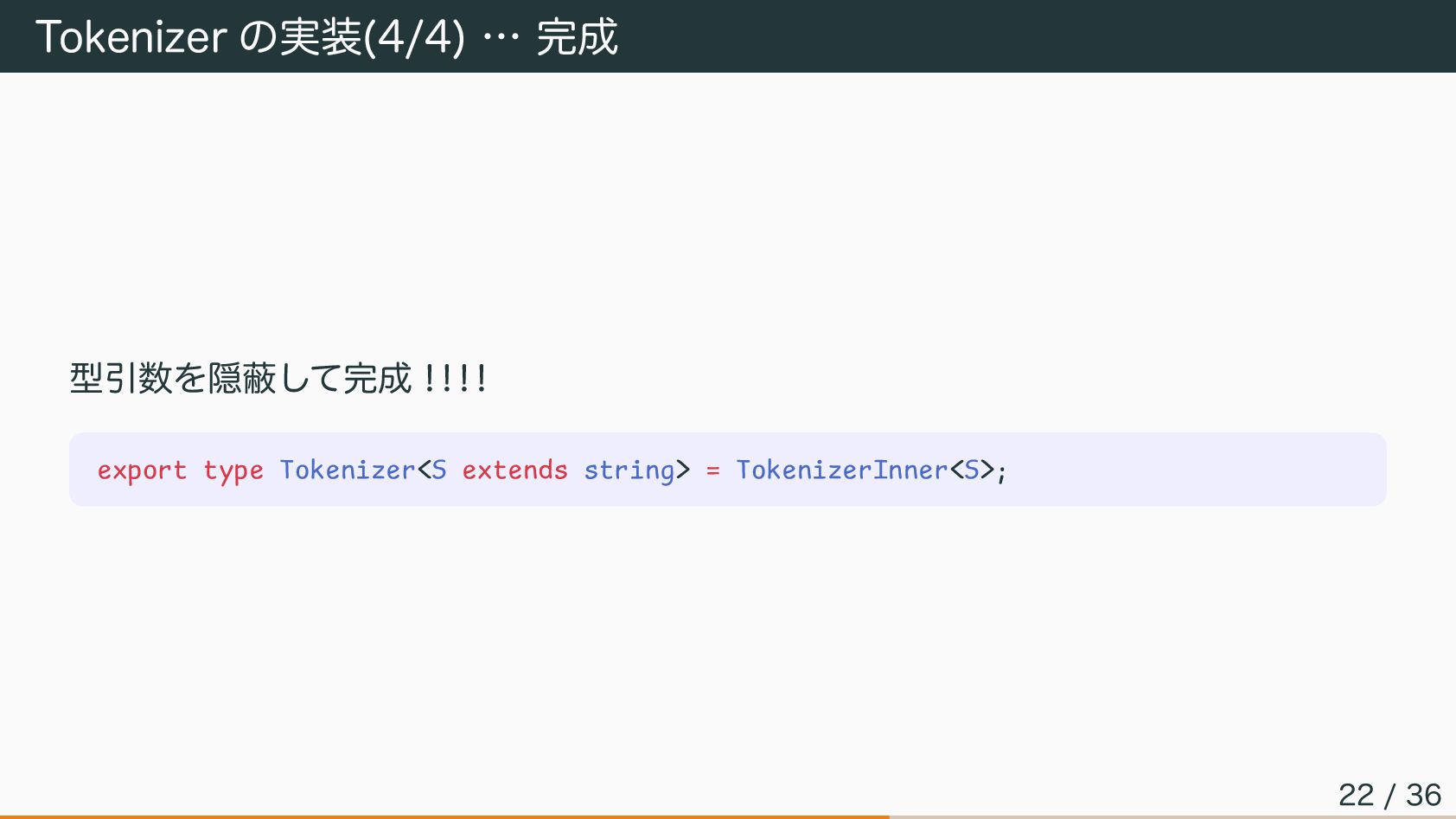 Tokenizer の実装(4/4) … 完成 型引数を隠蔽して完成! ! ! ! export type