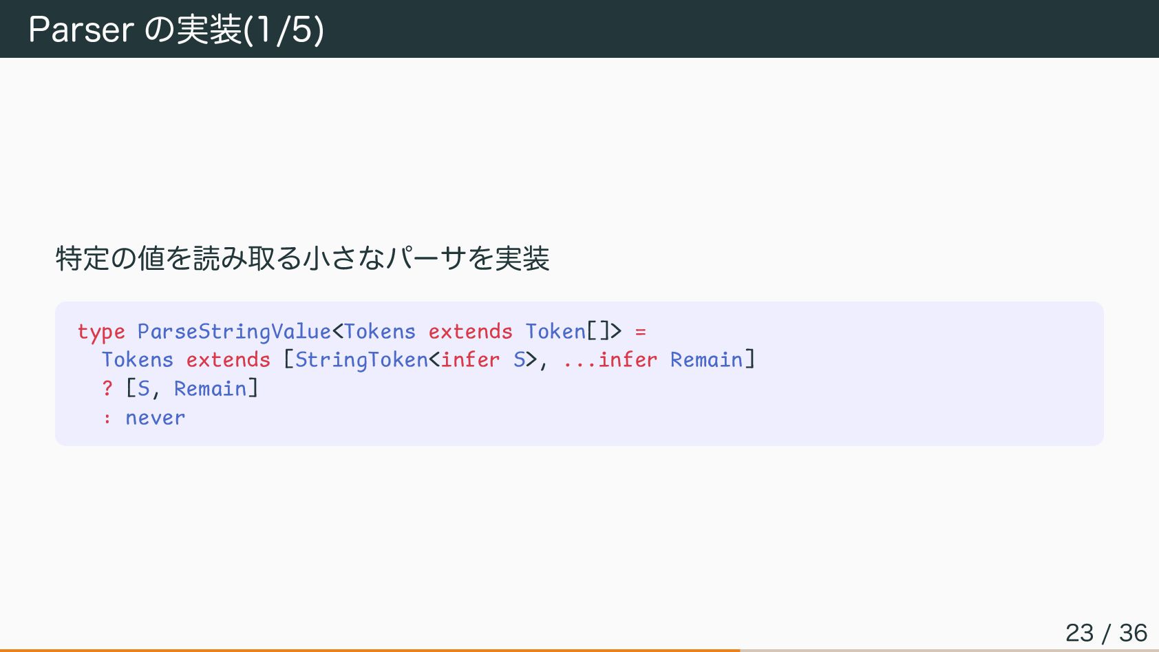 Parser の実装(1/5) 特定の値を読み取る小さなパーサを実装 type ParseStringValue<Tokens extends Token[]> = Tokens extends