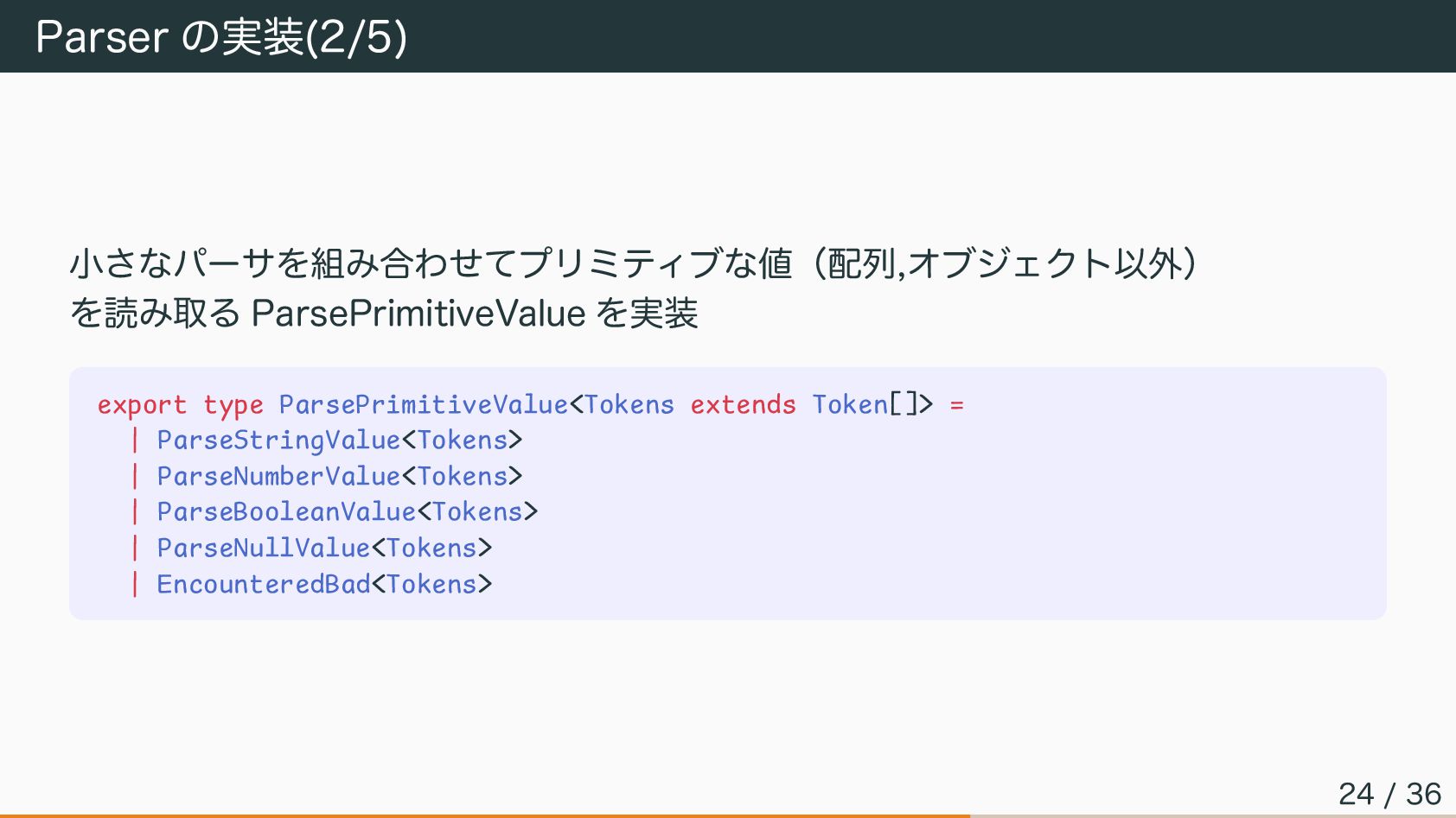 Parser の実装(2/5) 小さなパーサを組み合わせてプリミティブな値(配列,オブジェクト以外) を読み取る ParsePrimitiveValue を実装 export type ParsePrimitiveValue<Tokens extends