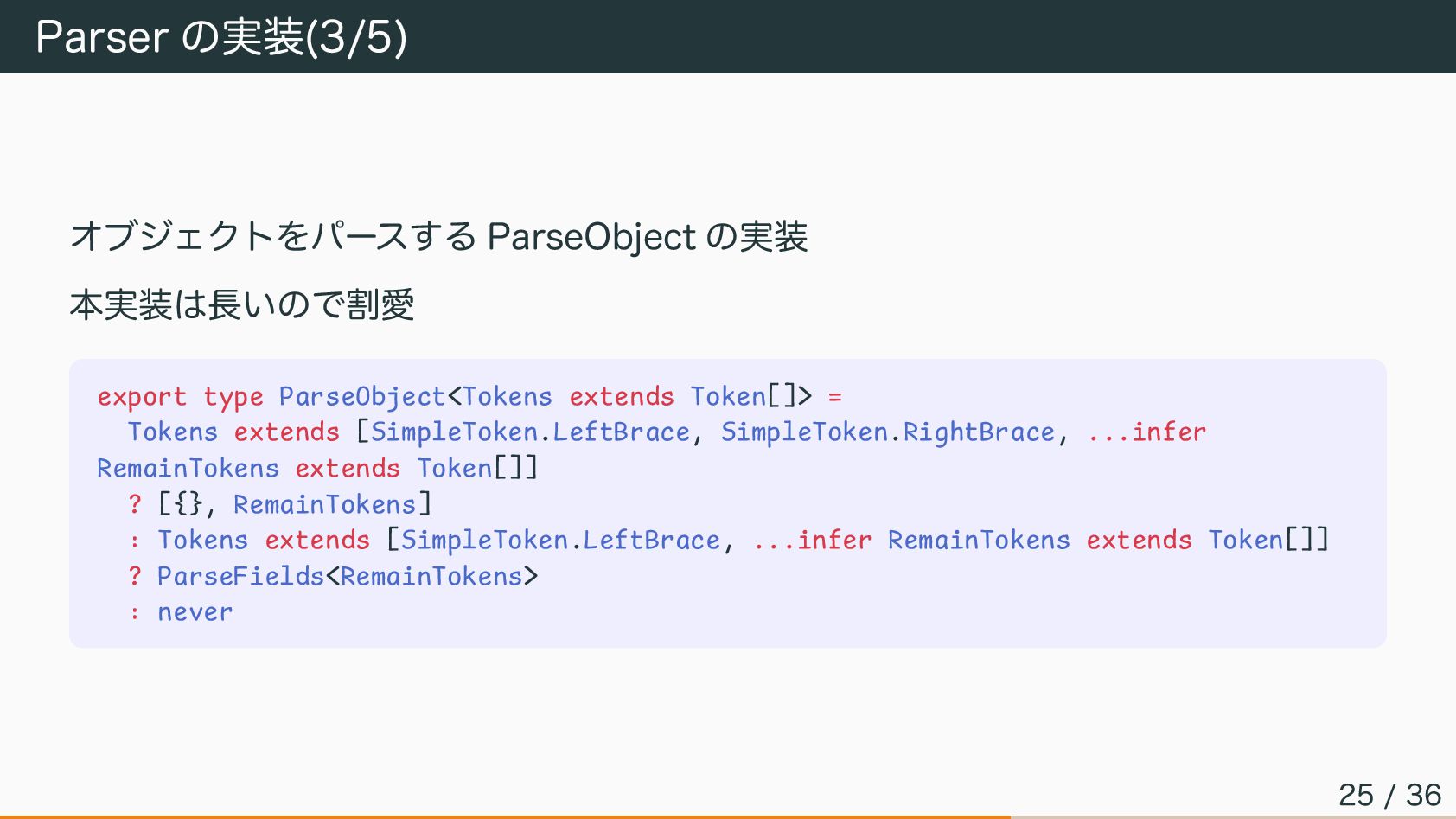Parser の実装(3/5) オブジェクトをパースする ParseObject の実装 本実装は長いので割愛 export type ParseObject<Tokens extends