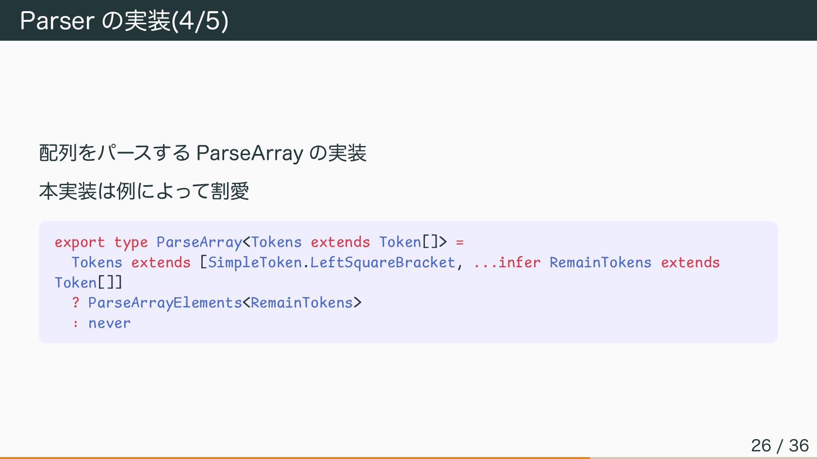Parser の実装(4/5) 配列をパースする ParseArray の実装 本実装は例によって割愛 export type ParseArray<Tokens extends